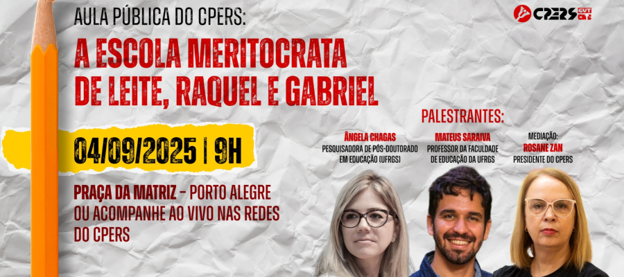 O debate vai expor como a chamada “escola meritocrata” defendida pelo governador Eduardo Leite (PSD), a secretária da Educação, Raquel Teixeira, o vice-governador, Gabriel Souza (MDB), e a base aliada do governo na Assembleia Legislativa ameaça o direito à educação pública de qualidade, precariza o trabalho docente e amplia as desigualdades.