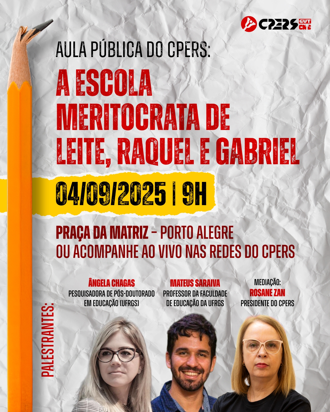 O CPERS convida toda a categoria — professoras(es), funcionárias(os) e especialistas, da ativa e aposentadas(os) —, estudantes e toda a comunidade escolar para participar de uma Aula Pública sobre os rumos da educação no Rio Grande do Sul.