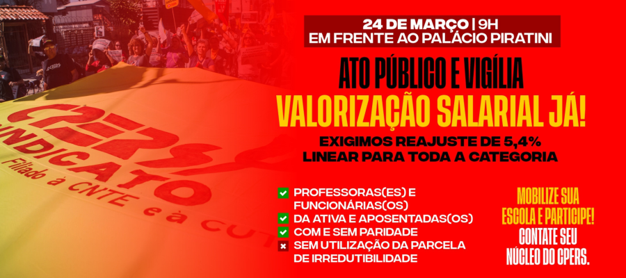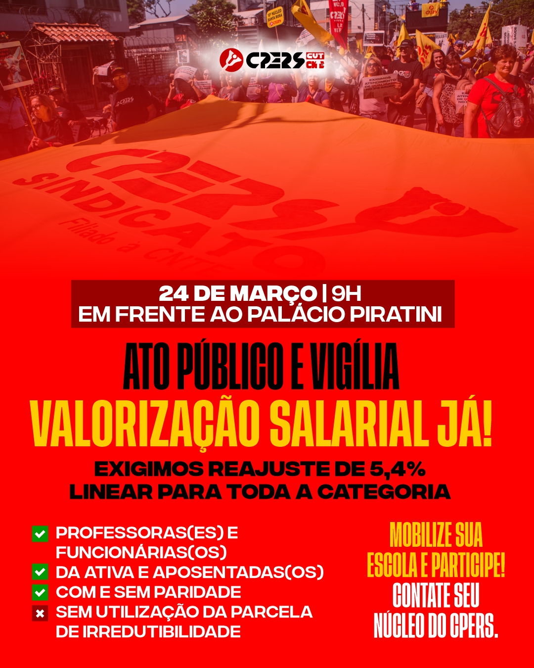 Agora, a votação ficou para a próxima terça-feira, 24 de março — e é nesse dia que precisamos mostrar ainda mais força! Por isso, estaremos novamente reunidas(os), em frente ao Palácio Piratini, a partir das 9h, para exigir 5,4% de reajuste para todas as trabalhadoras(es) da educação, sem a utilização da parcela de irredutibilidade.