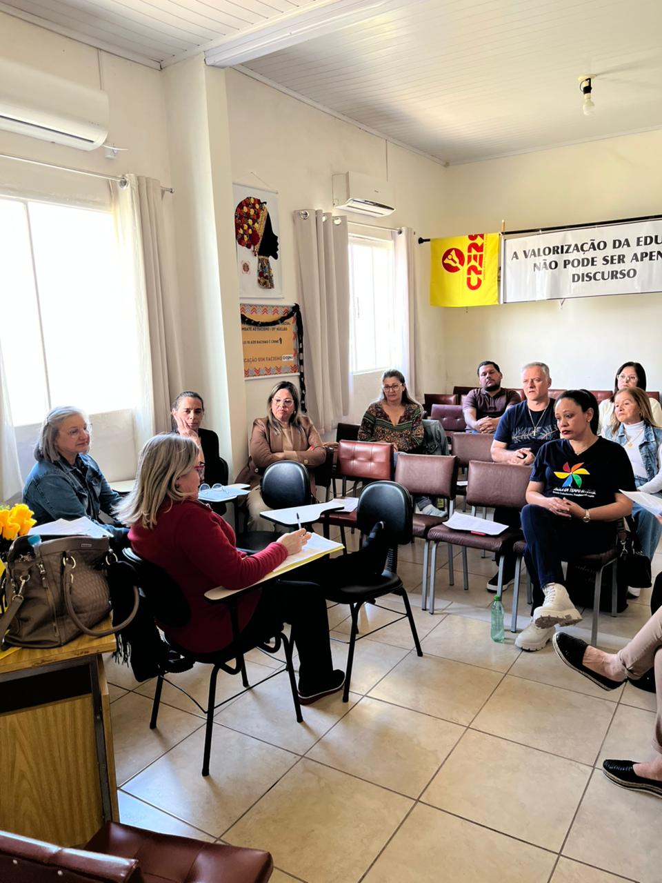 O encontro, realizado na sede do Núcleo, em Santiago, reuniu a coordenadora do Departamento de Saúde da(o) Trabalhadora(or), Vera Lessês, e o diretor, Leandro Wesz Parise. Durante a atividade, foram debatidos os principais desafios enfrentados diariamente pelas(os) profissionais da educação a partir de um texto proposto pela diretora.