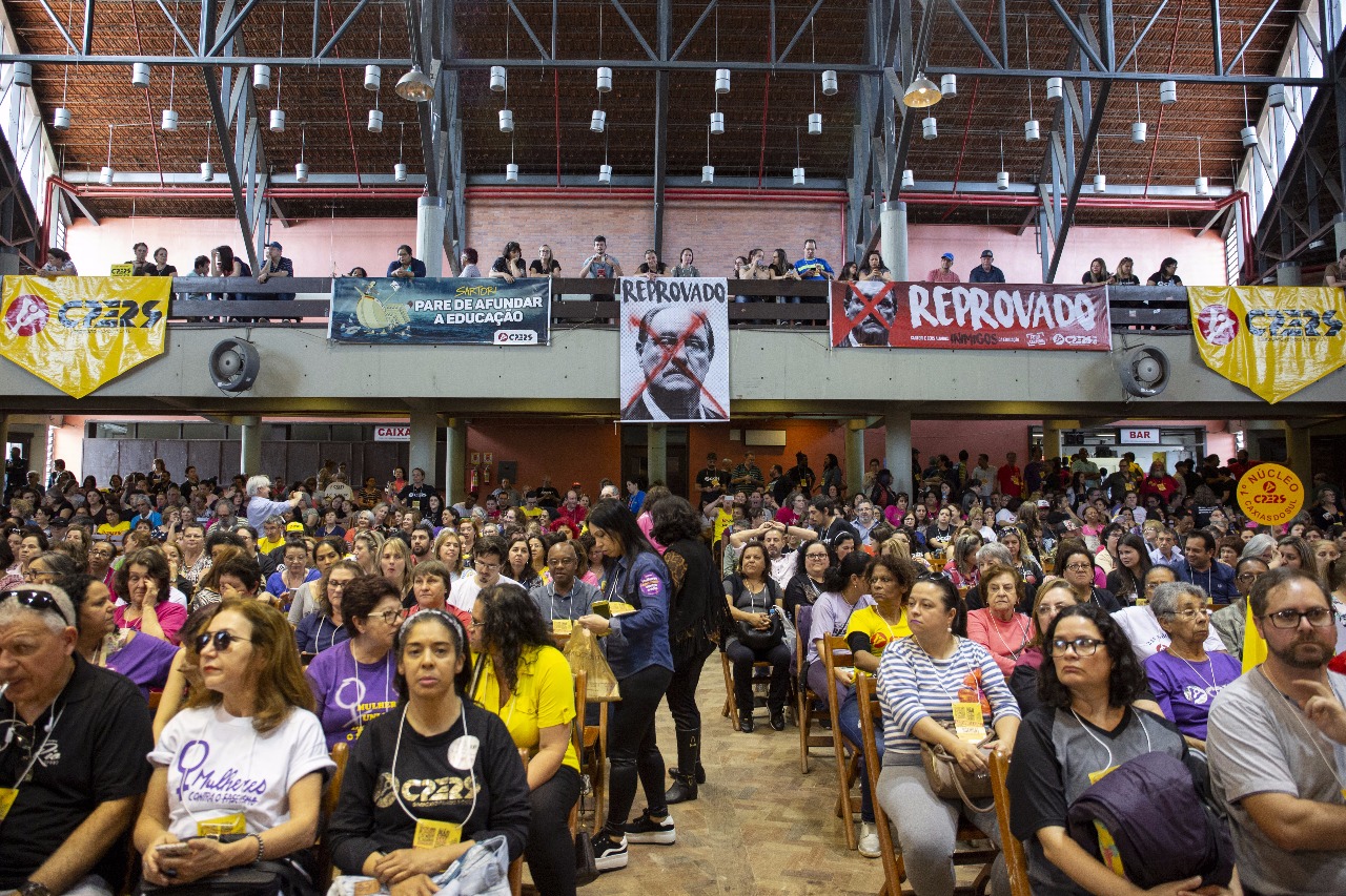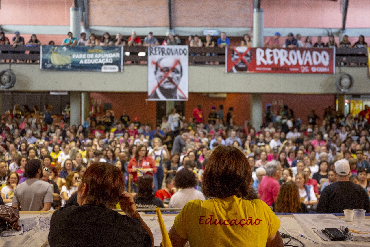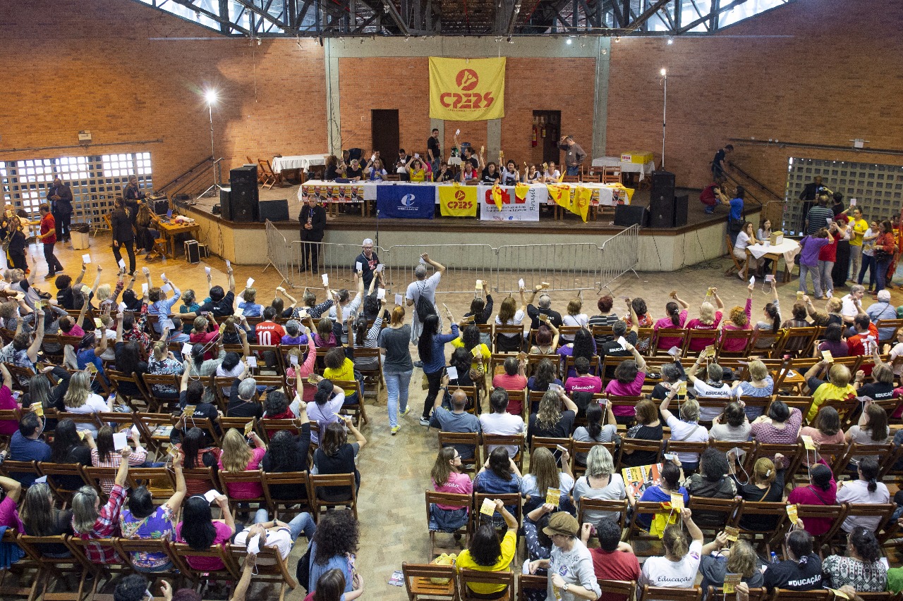 A próxima quinta-feira (4/10) será dia de greve para professores(as) e funcionários(as) de escola de toda a rede estadual, em protesto pelo pagamento integral do salário e contra o desmonte da escola pública. A mobilização foi deliberada pela categoria na Assembleia Geral desta sexta (28), com a presença de mais de 1.200 associados(as) do CPERS Sindicato na Casa do Gaúcho.