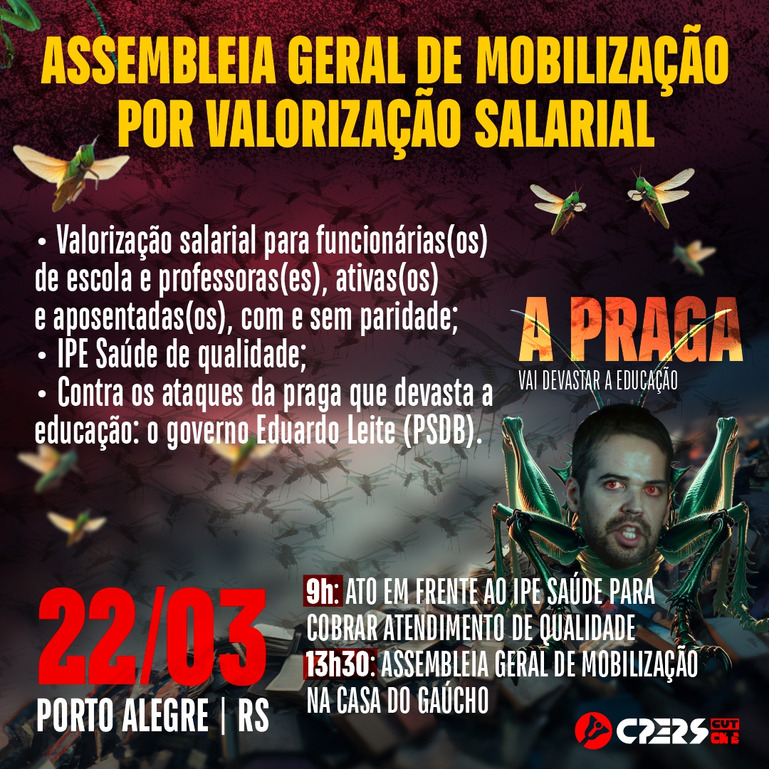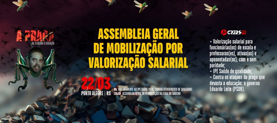 A partir das 13h30, na Casa do Gaúcho, em Porto Alegre, vamos realizar uma grande Assembleia Geral para definir os próximos passos da mobilização pela valorização salarial das(os) funcionárias(os) e professoras(es), nomeadas(os) e contratadas(os), ativas(os) e aposentadas(os), com e sem paridade, e contra os ataques do governo Eduardo Leite (PSDB), que têm devastado a educação gaúcha.