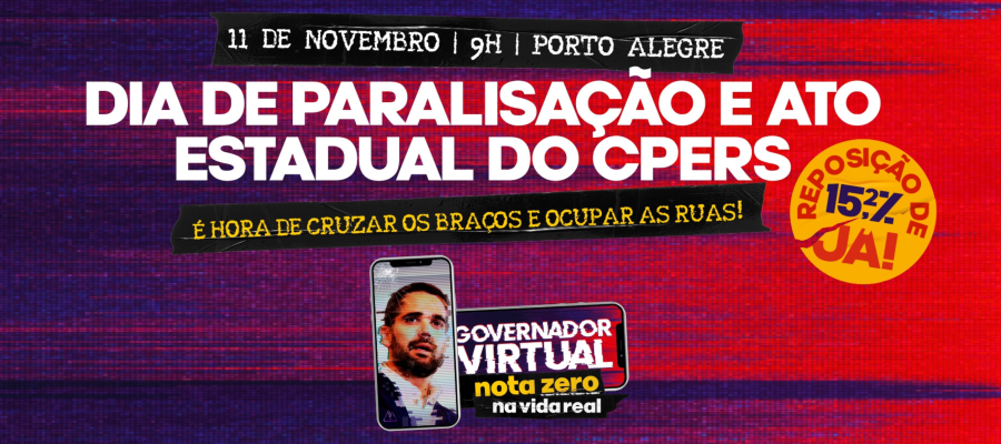 O CPERS convoca todas as educadoras e os educadores da rede estadual — professoras(es), funcionárias(os) e especialistas, da ativa e aposentadas(os) —, para um grande Dia de Paralisação e Ato Estadual, em Porto Alegre.