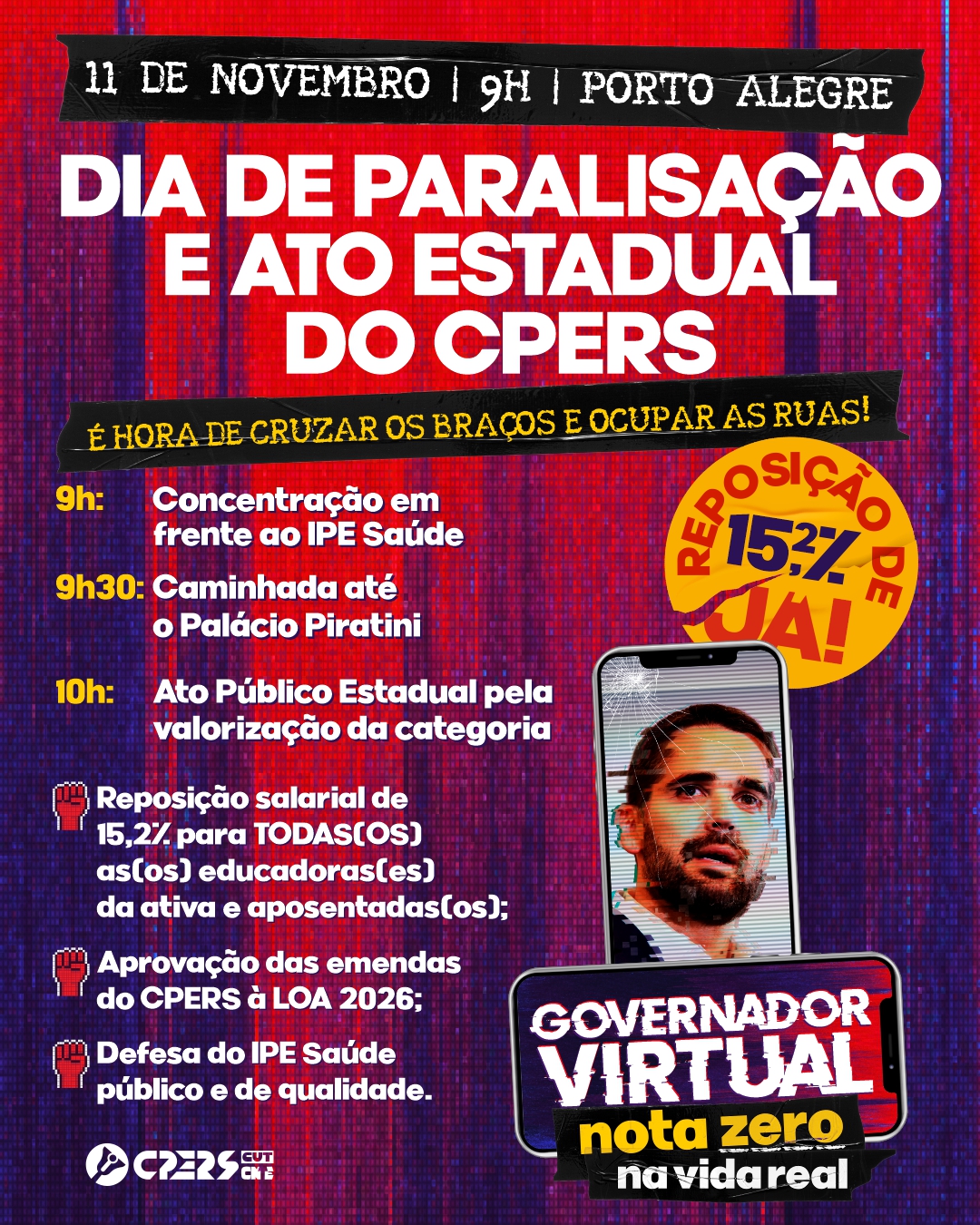 No dia 11 de novembro, a partir das 9h, com concentração em frente ao IPE Saúde, denunciaremos o arrocho salarial imposto pelo governo Eduardo Leite (PSD), que insiste em tratar o funcionalismo público com descaso, enquanto investe em marketing e propaganda para mascarar a falta de valorização real. Após, seguiremos em caminhada até o Palácio Piratini para a realização do Ato Público Estadual, a partir das 10h.