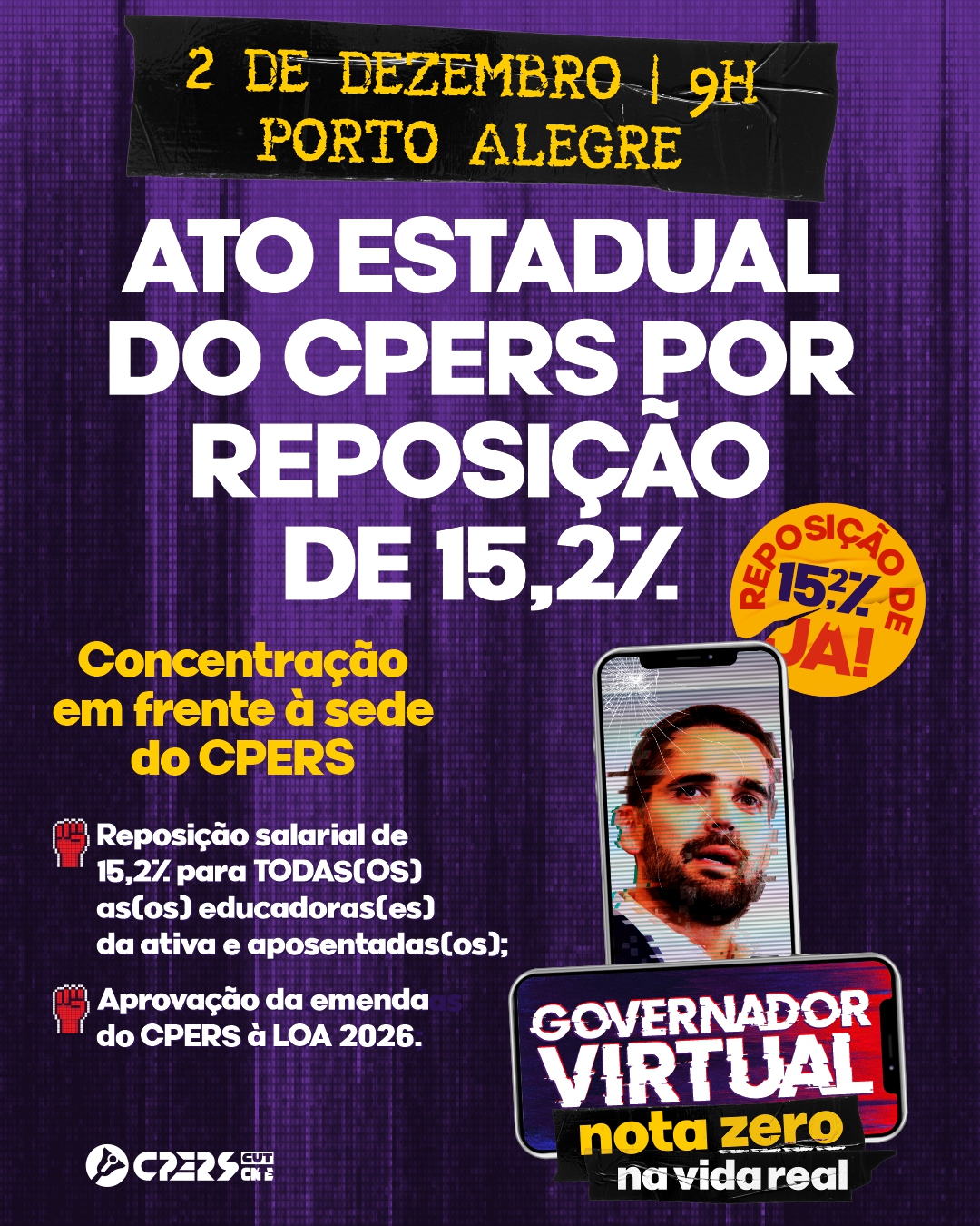É hora de ocupar as ruas, defender nossos direitos e fazer valer a voz da educação pública! Contate o seu Núcleo e venha com o CPERS lutar por #ReposiçãoJá!