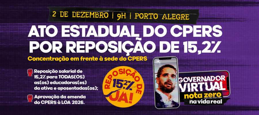 O CPERS convoca todas(os) as(os) professoras(es) e funcionárias(os) de escola, da ativa e aposentadas(os), para estarem em Porto Alegre defendendo a inclusão da emenda construída pelo Sindicato em parceria com a CUT-RS e a CTB-RS. Essa emenda garante a reposição de 15,2% para TODA a categoria, passo fundamental na reconstrução das nossas carreiras, salários e dignidade profissional.