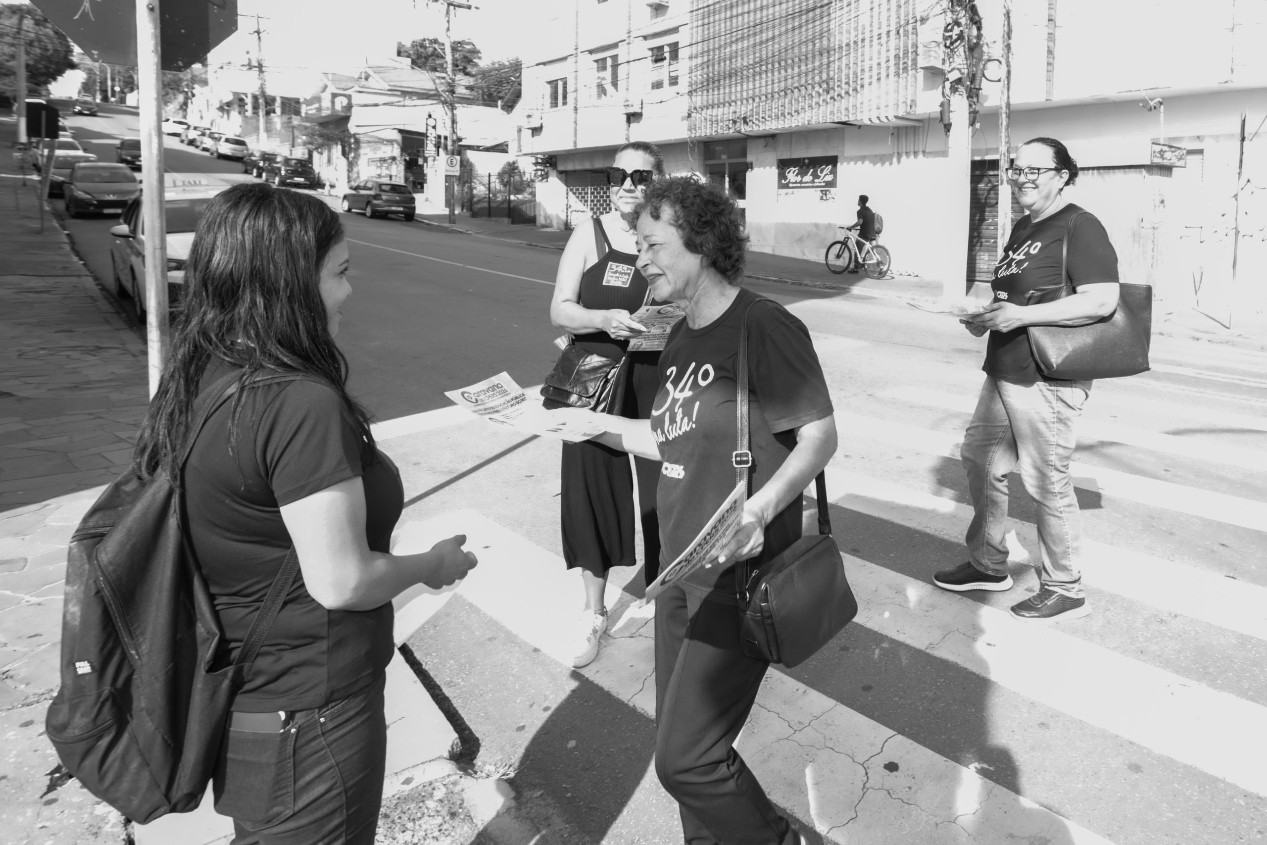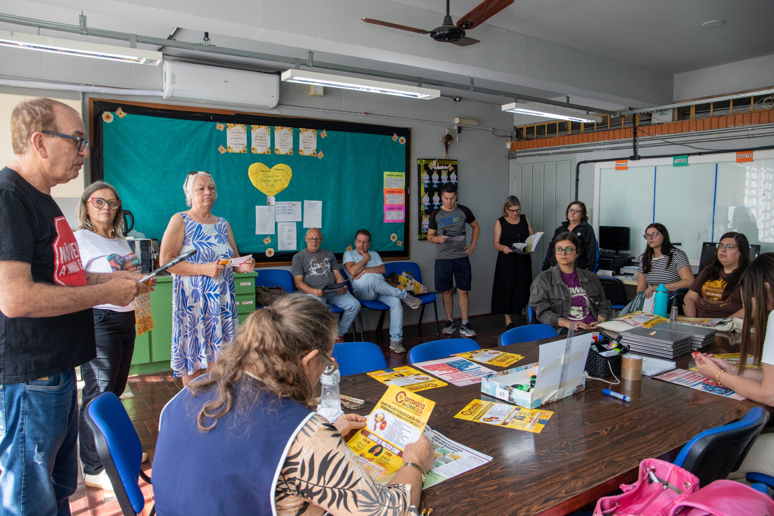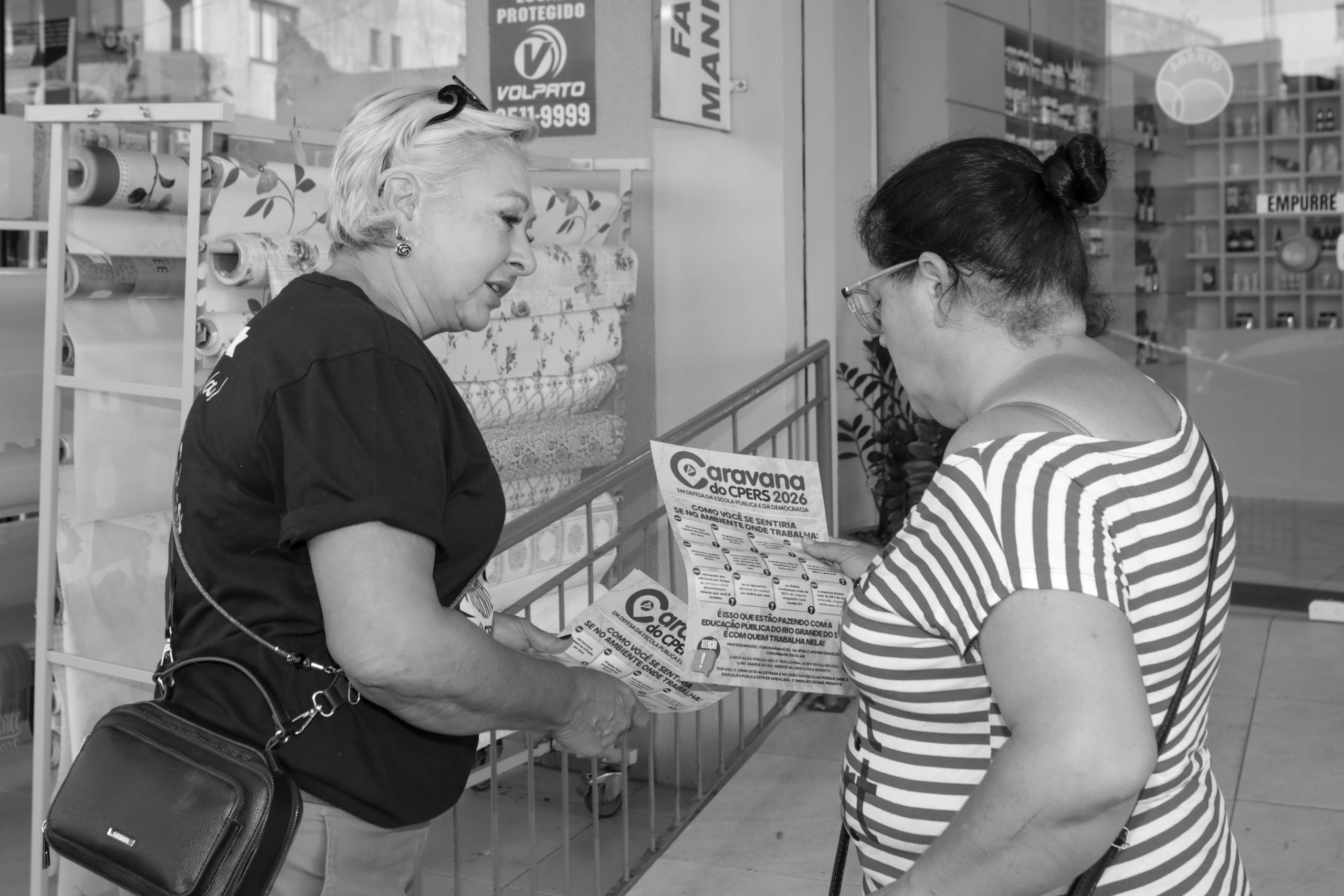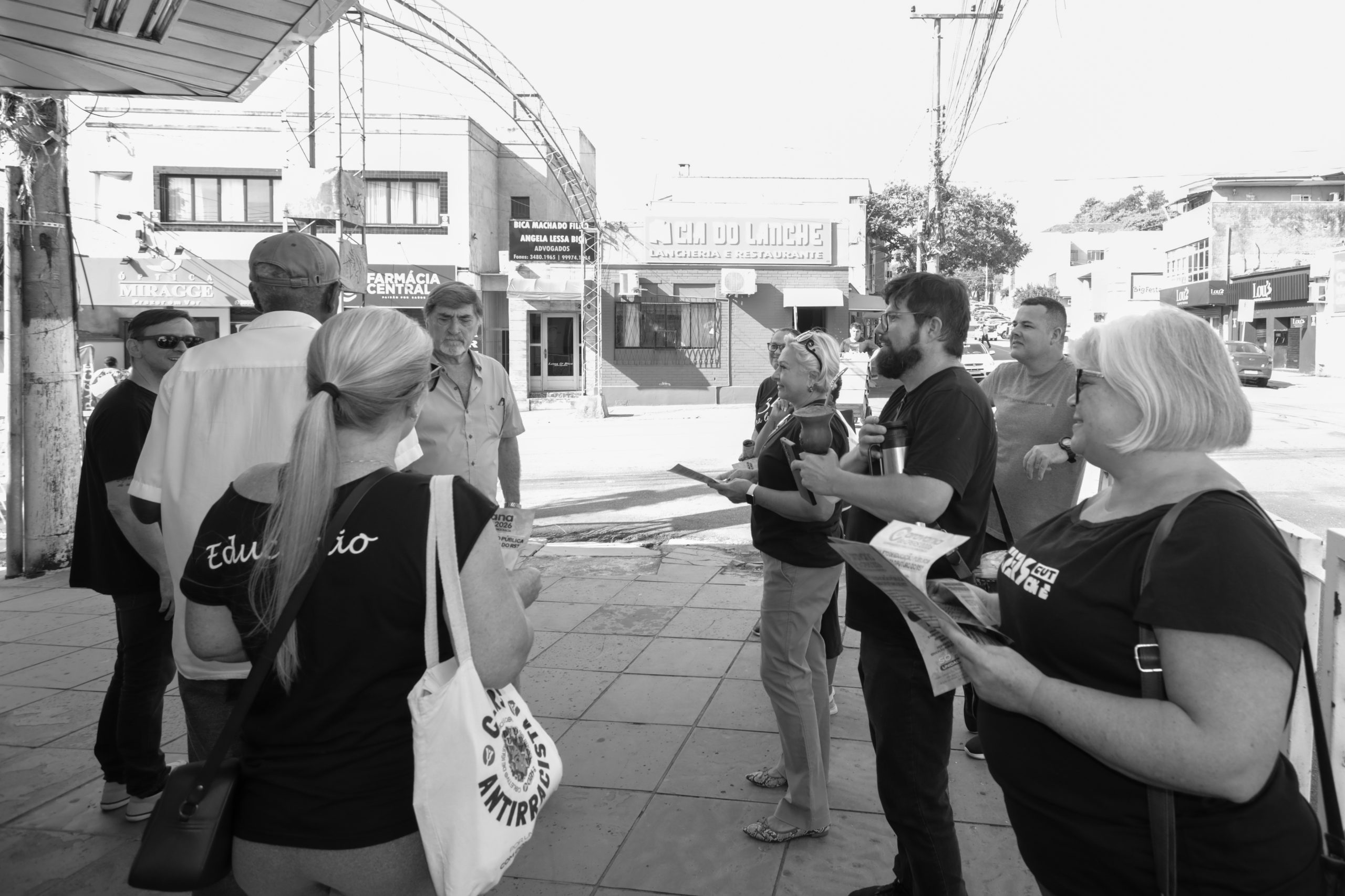 Dentro da programação da Caravana, pela manhã, foi realizada uma panfletagem nas ruas centrais de Guaíba (34º Núcleo), com escuta e diálogo direto com a população sobre o futuro da educação pública no Rio Grande do Sul.