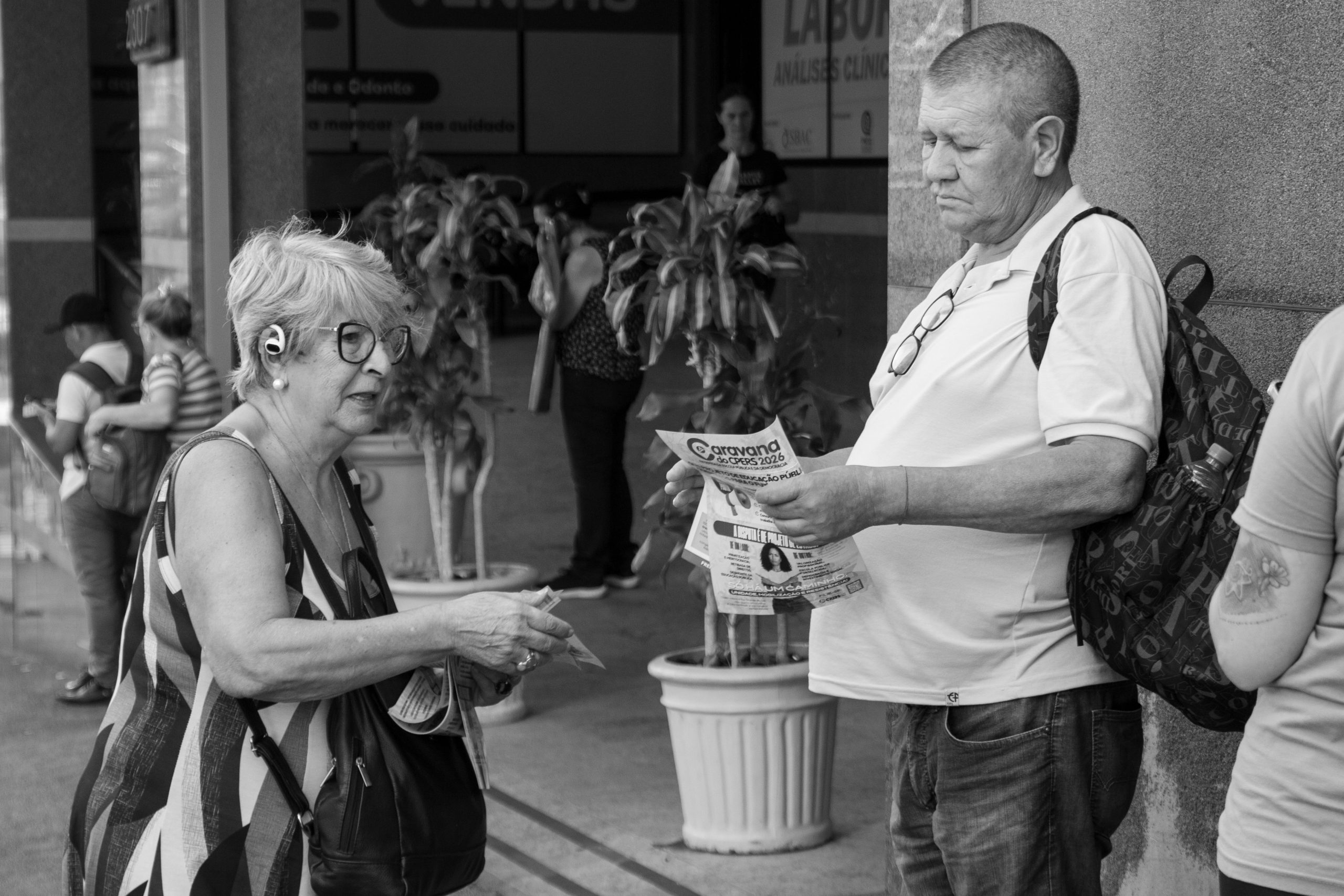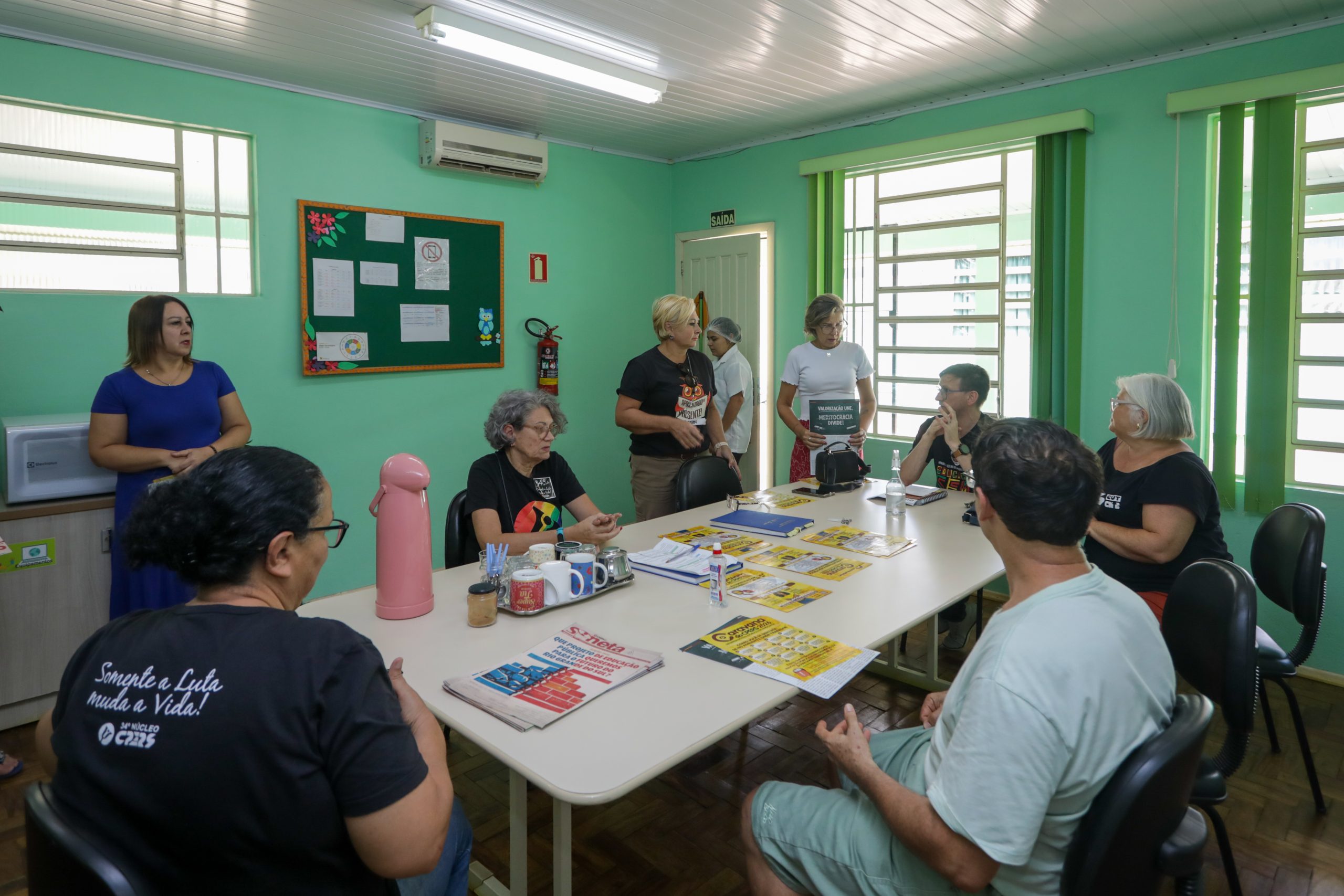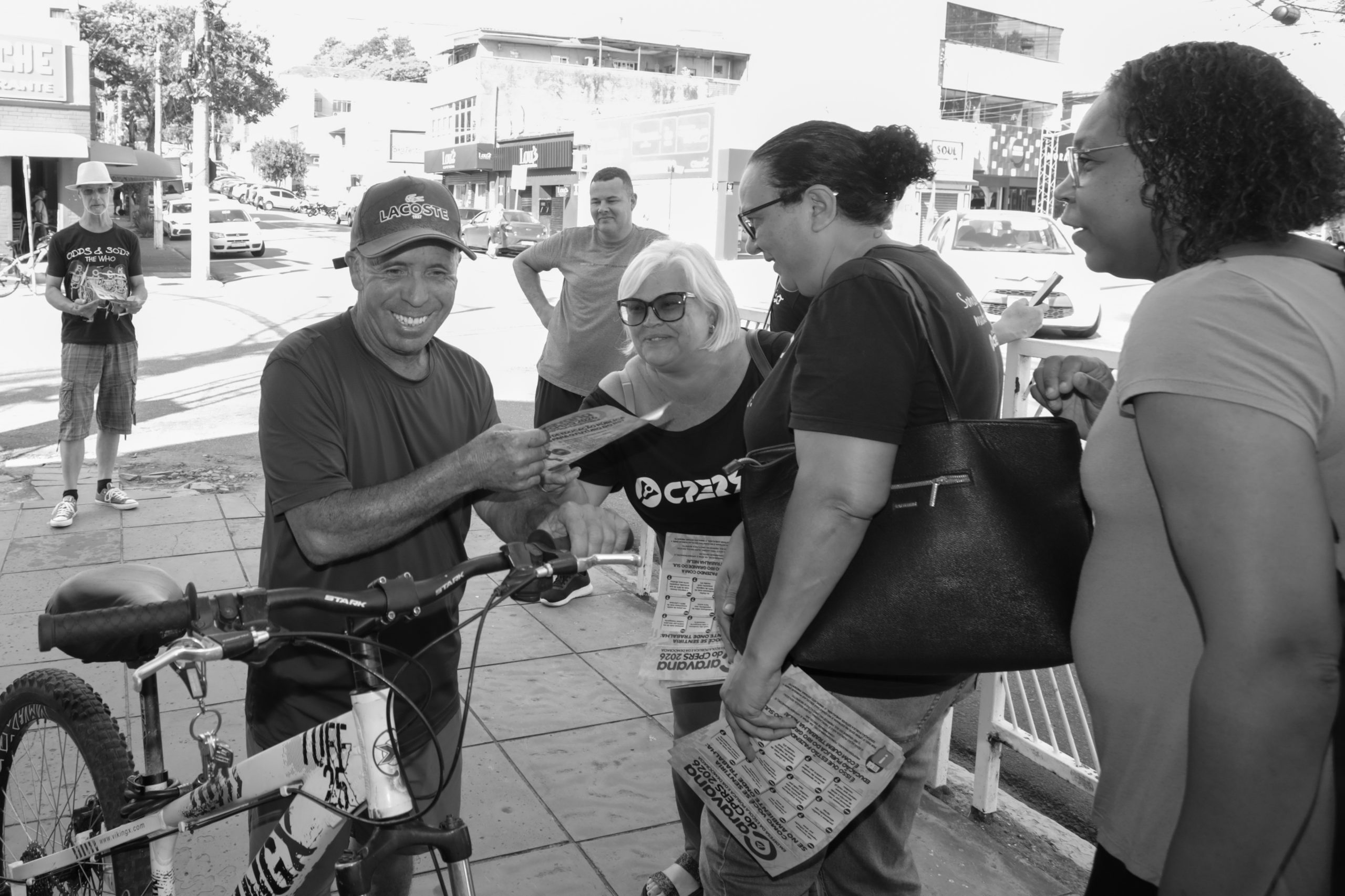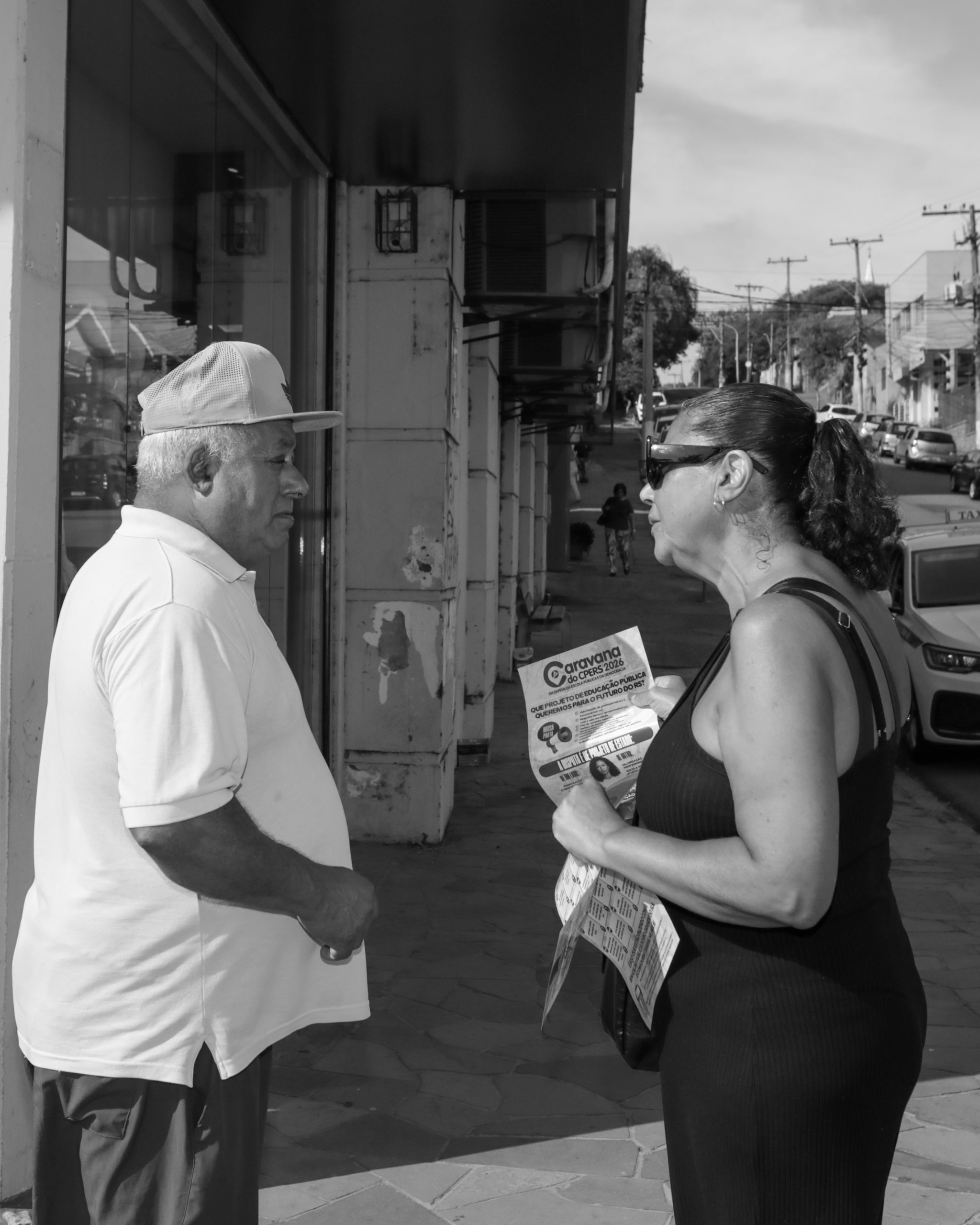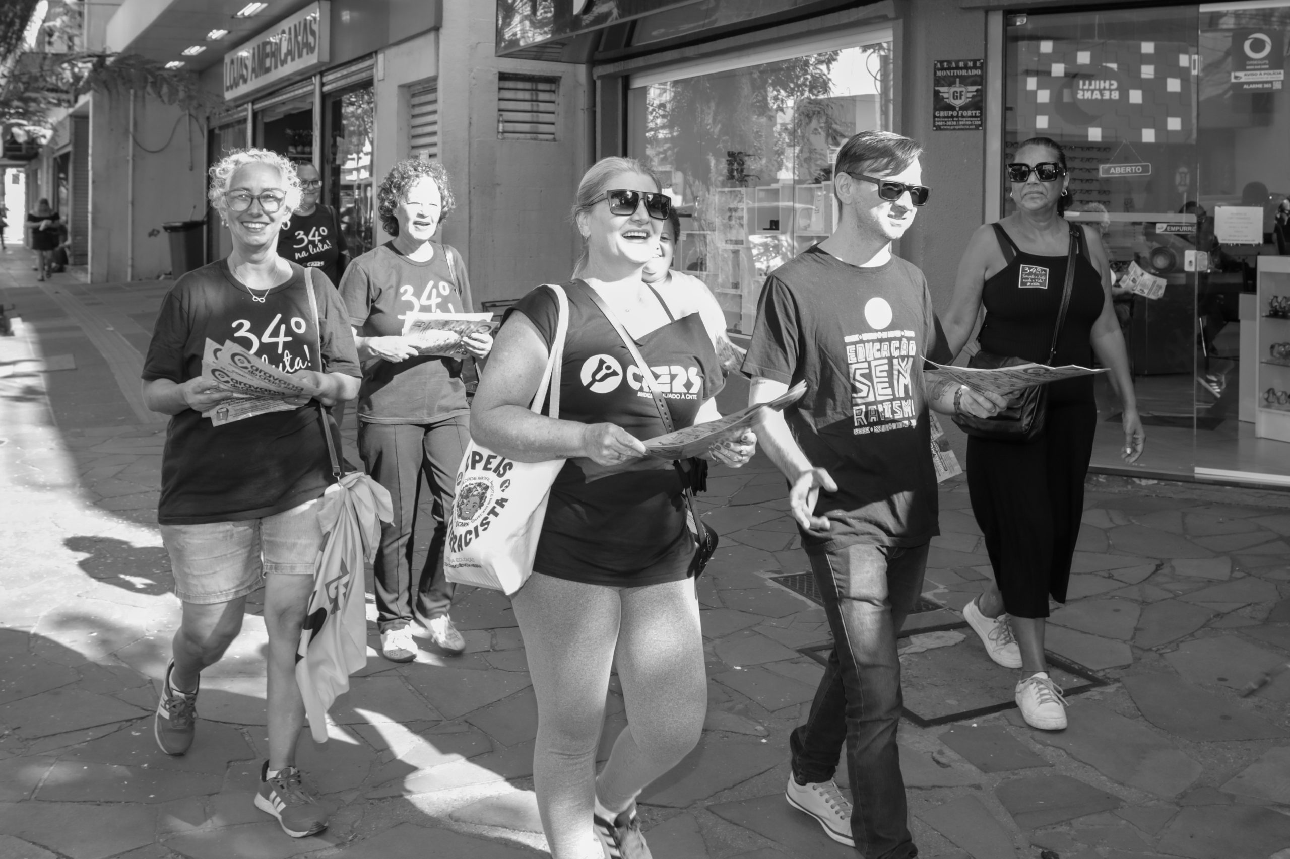 Dentro da programação da Caravana, pela manhã, foi realizada uma panfletagem nas ruas centrais de Guaíba (34º Núcleo), com escuta e diálogo direto com a população sobre o futuro da educação pública no Rio Grande do Sul.
