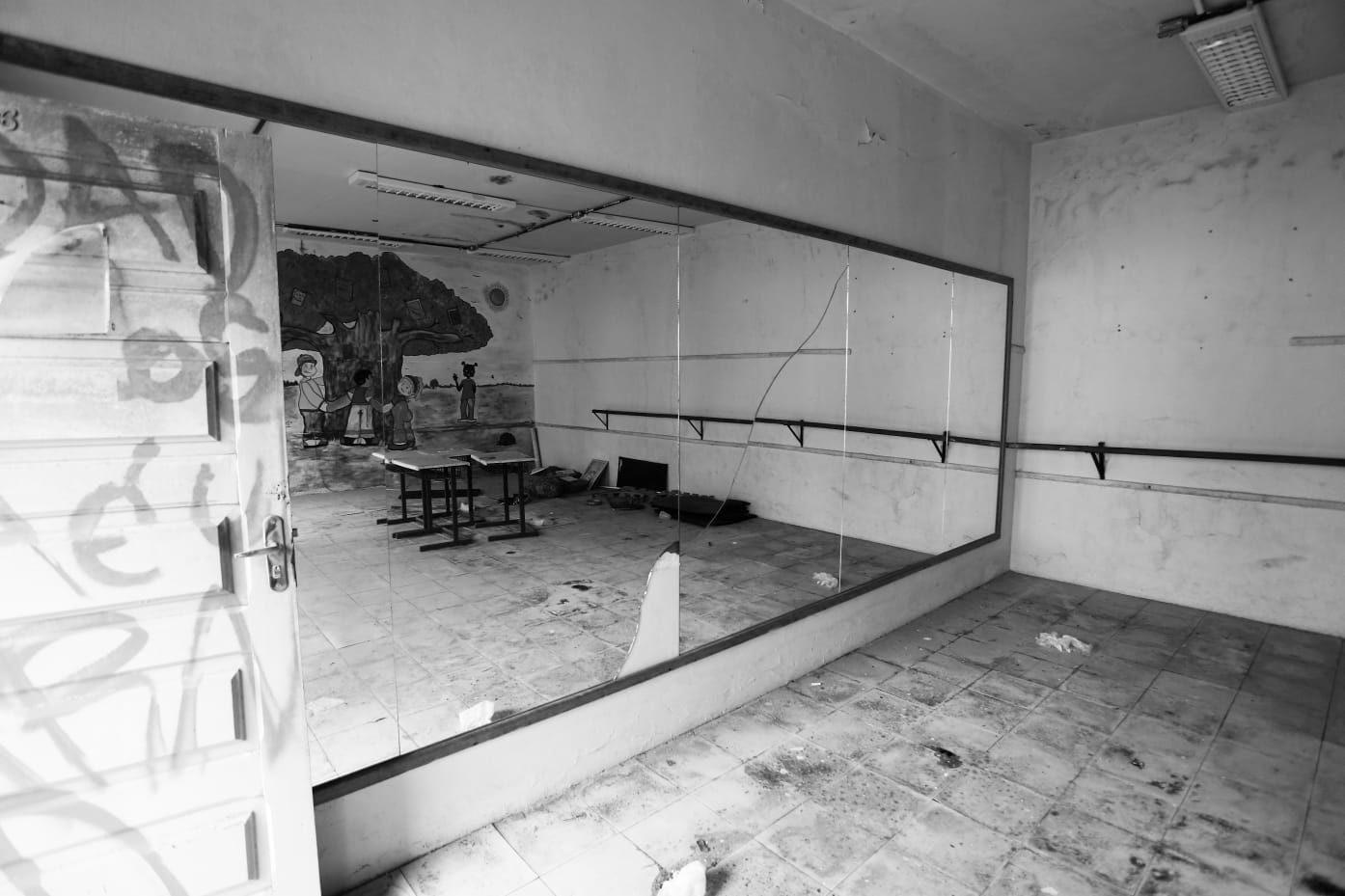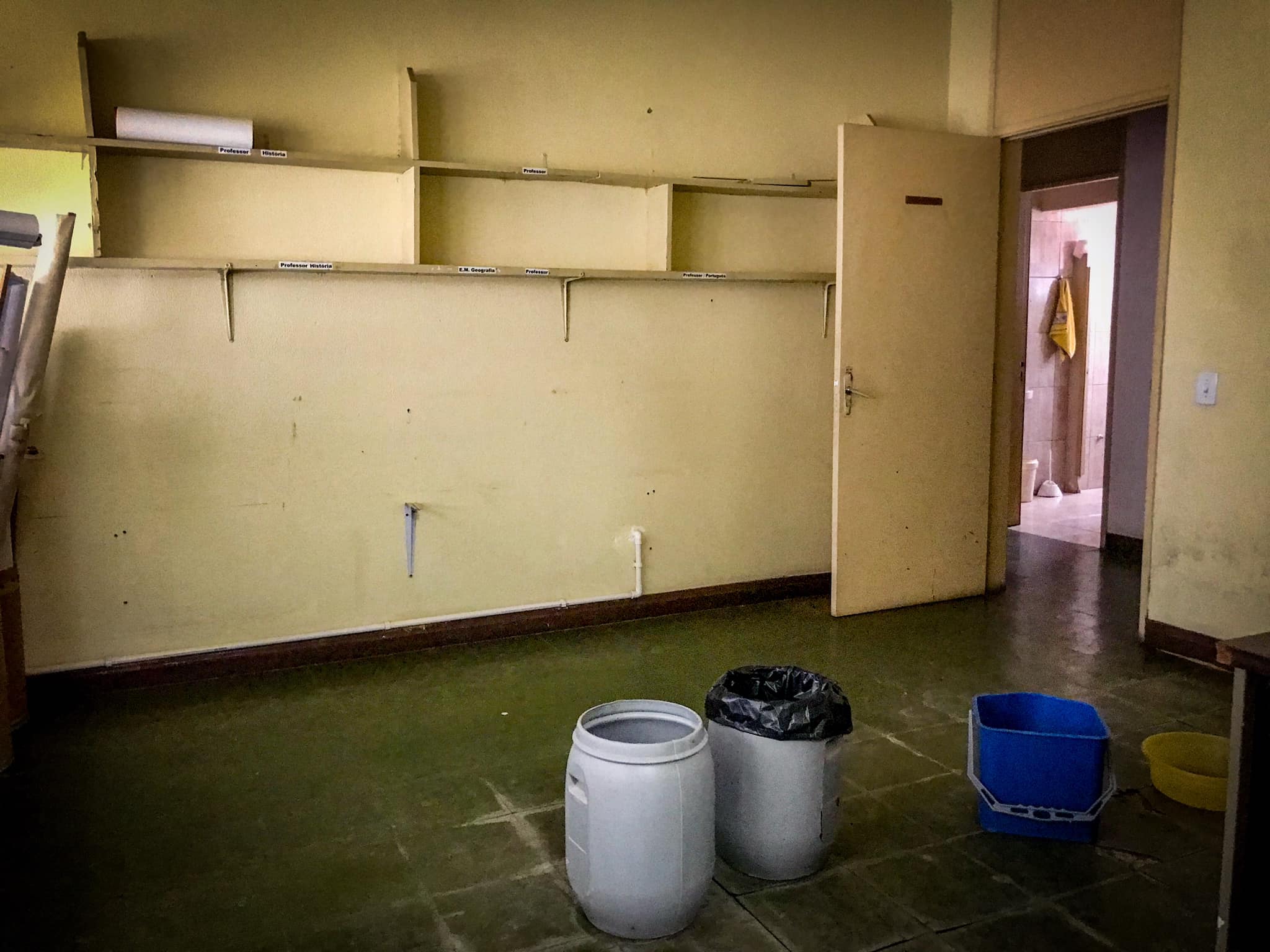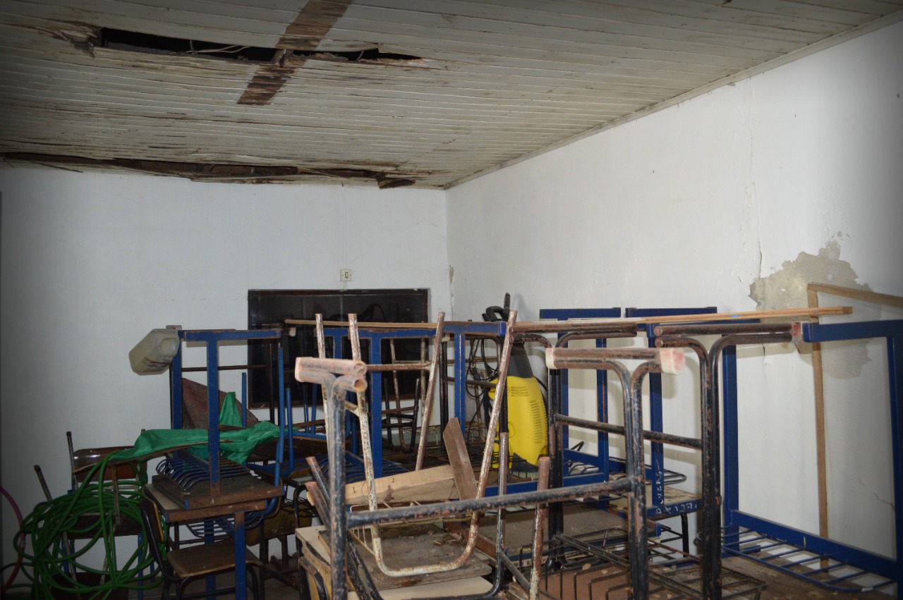 A instituição também está com um dos banheiros interditado, azulejos caindo e sala de aula que virou depósito. Faltam professores(as) para a sala de recursos, monitor, orientador e funcionário para a limpeza.