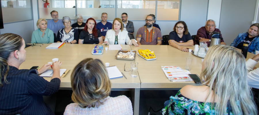 Logo na abertura da reunião, a presidente do CPERS, Rosane Zan, entregou à secretária a pauta de reivindicações aprovada na Assembleia Geral do Sindicato, realizada no dia 3 de outubro. O documento abrange temas centrais como salário e remuneração, carreira, previdência e saúde da(o) trabalhadora(or), condições de trabalho e segurança e questões pedagógicas. Também foi entregue a Carta da Aula Pública promovida pela entidade, que denuncia os riscos da política meritocrática imposta pelo governo e a falta de escuta da comunidade escolar sobre o PL 347.