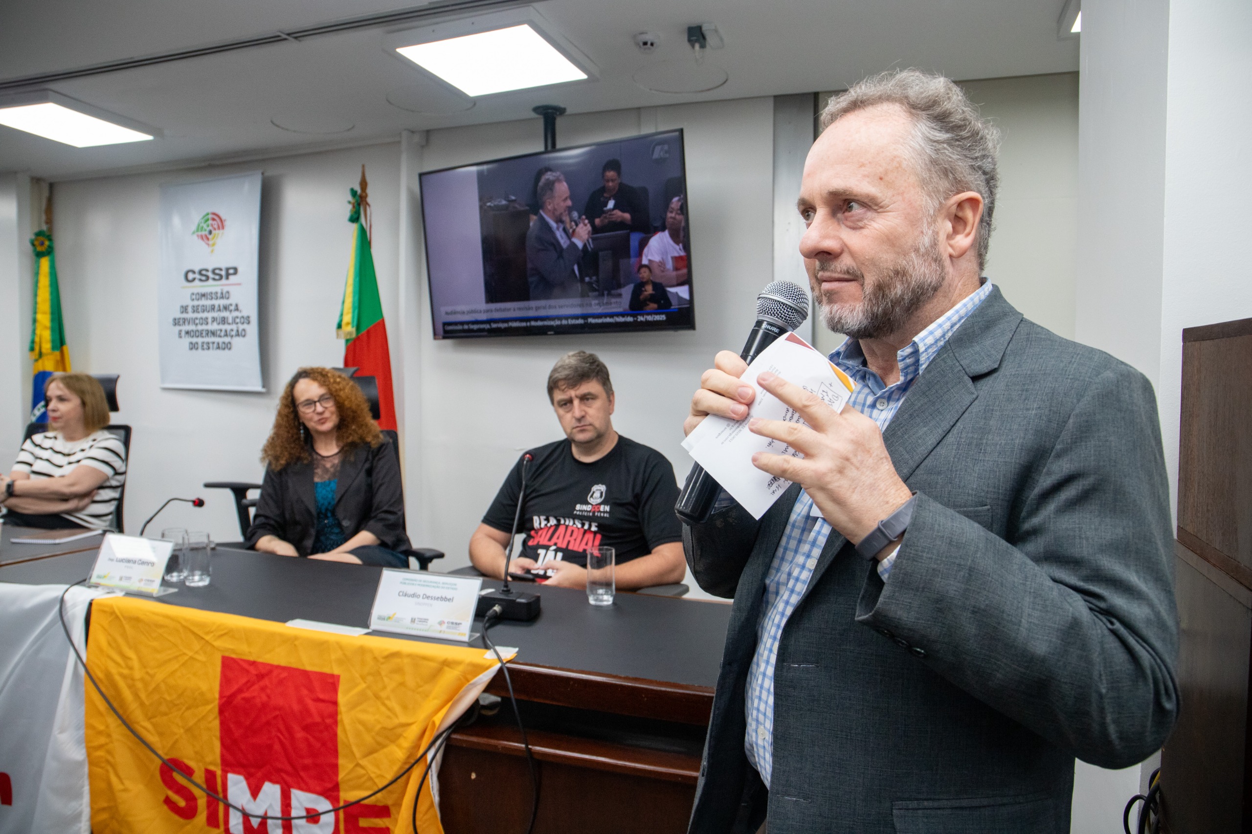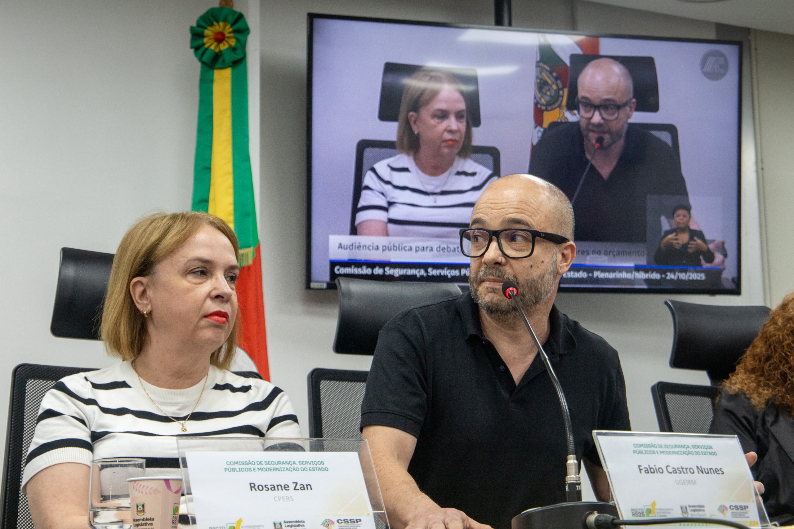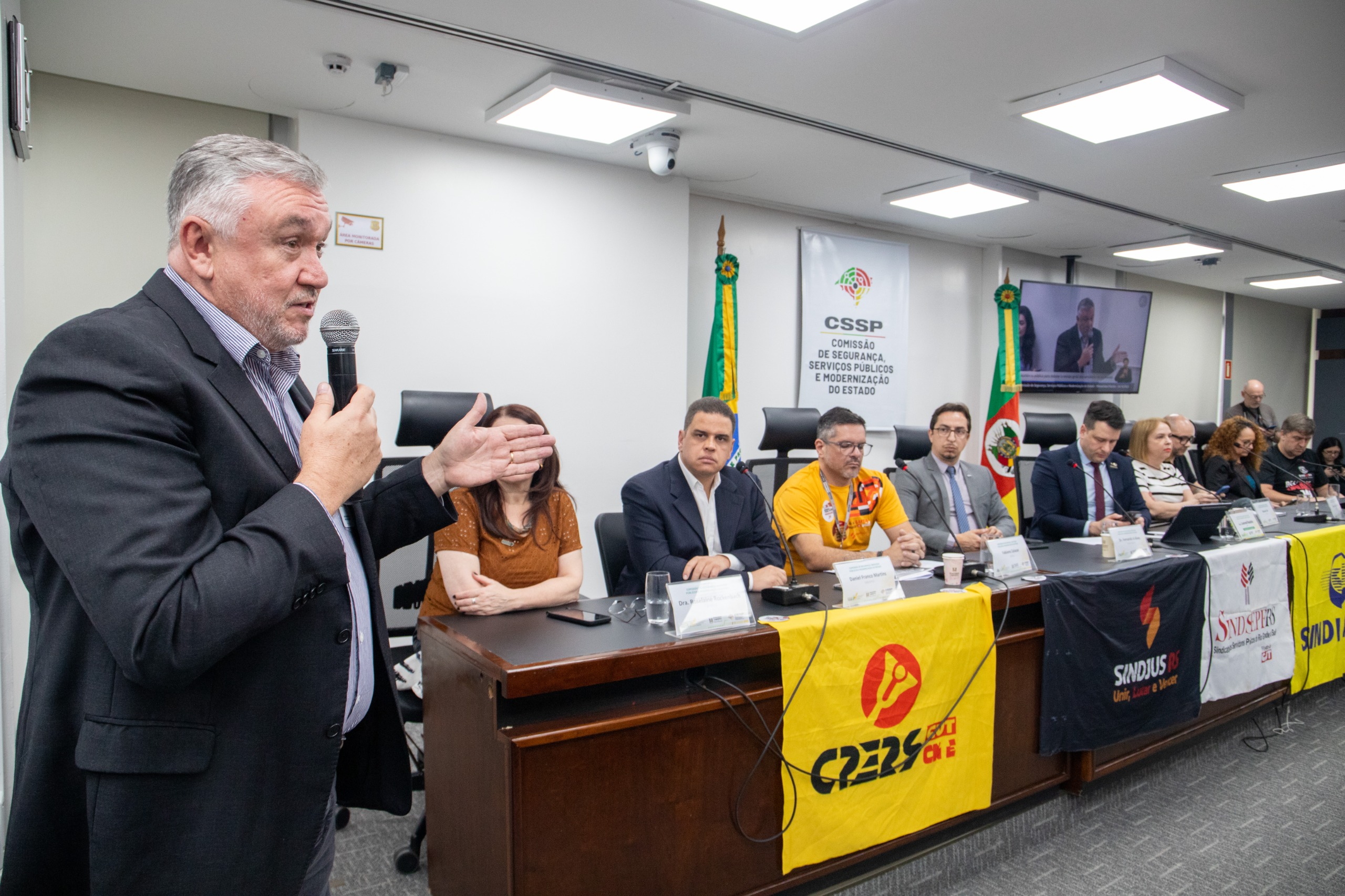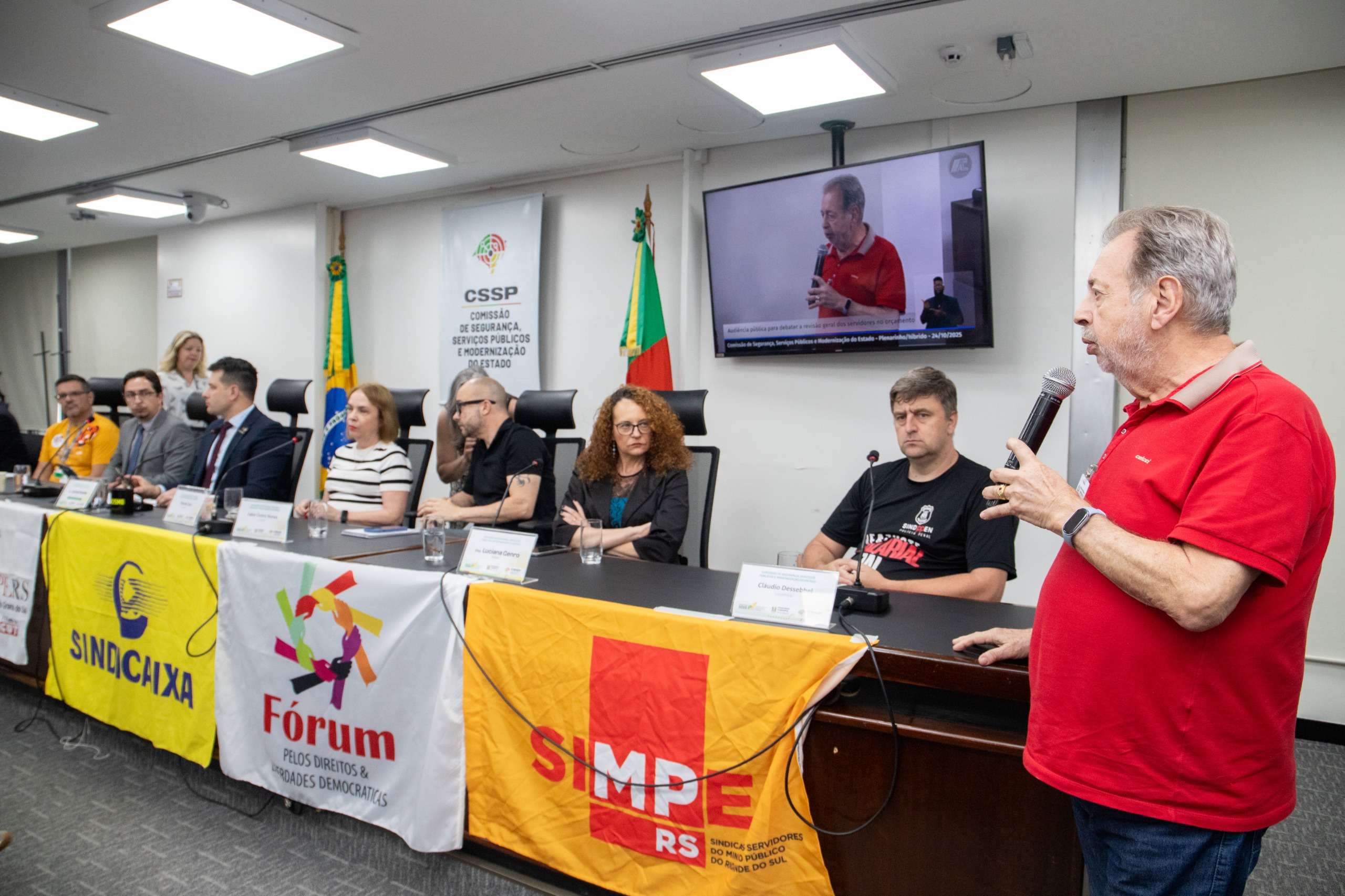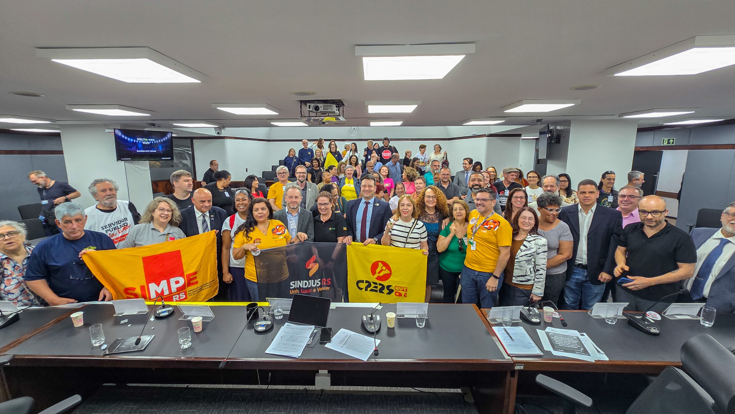 Na tarde desta sexta-feira (24), o CPERS esteve presente na Audiência Pública sobre a revisão geral dos salários no orçamento de 2026, promovida pela Comissão de Segurança, Serviços Públicos e Modernização do Estado (CSSP) da Assembleia Legislativa, presidida pelo deputado estadual Leonel Radde (PT). A atividade reuniu diversos sindicatos e organizações representantes das(os) servidoras(es) públicas(os) para debater as reivindicações e estratégias.