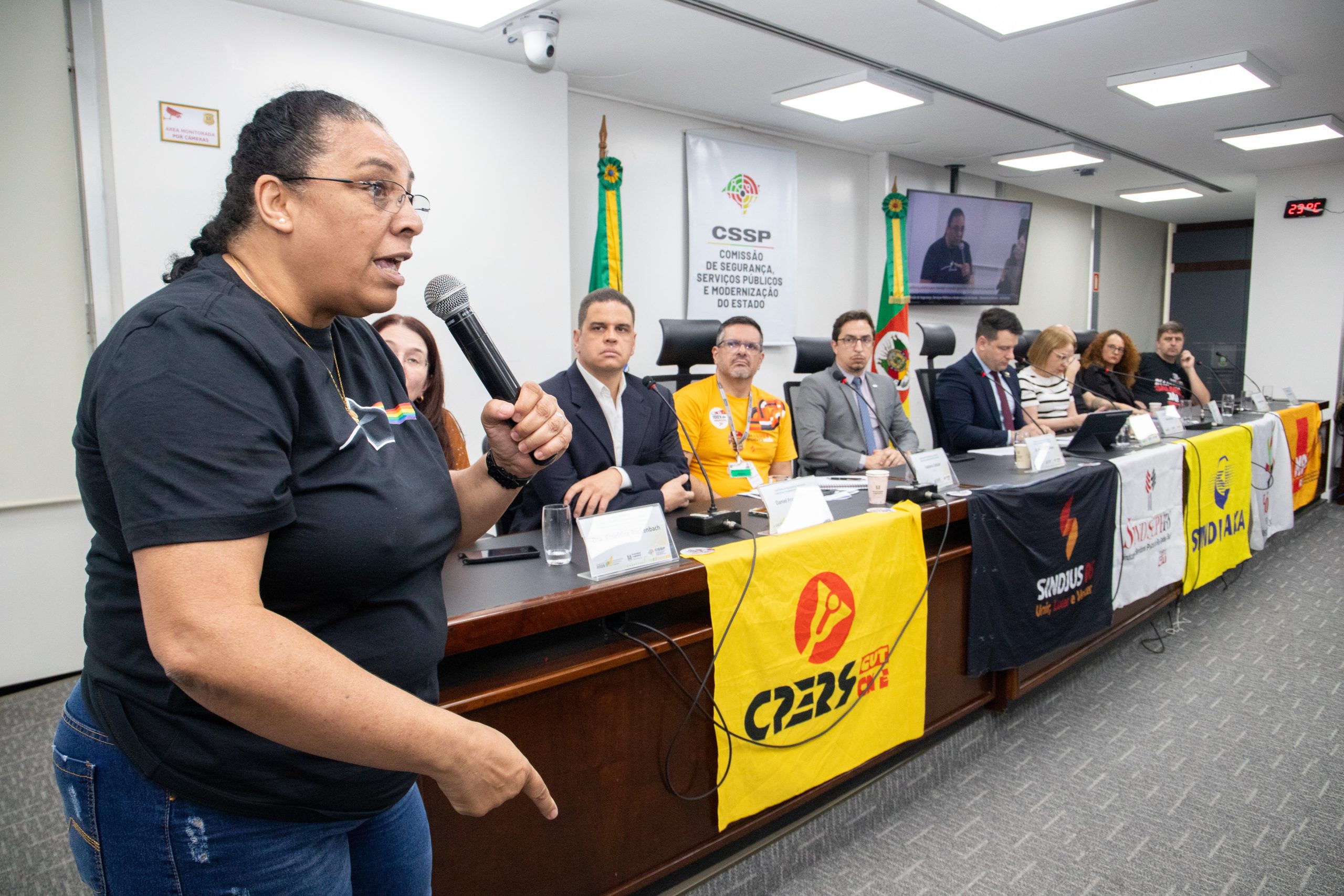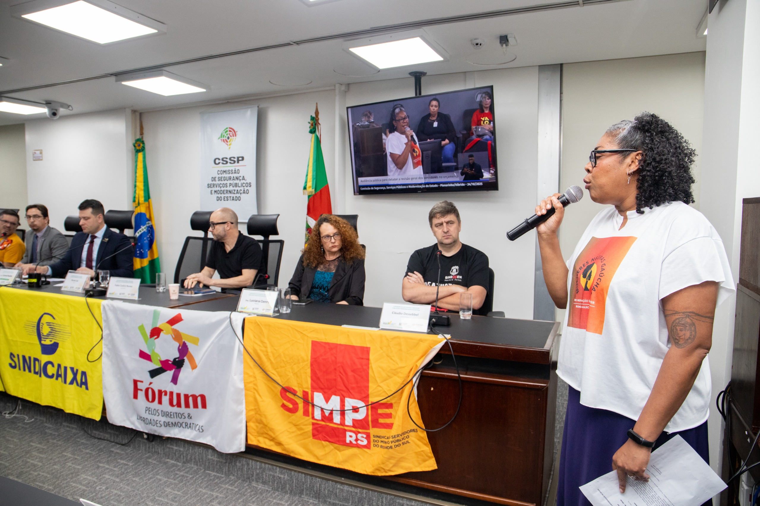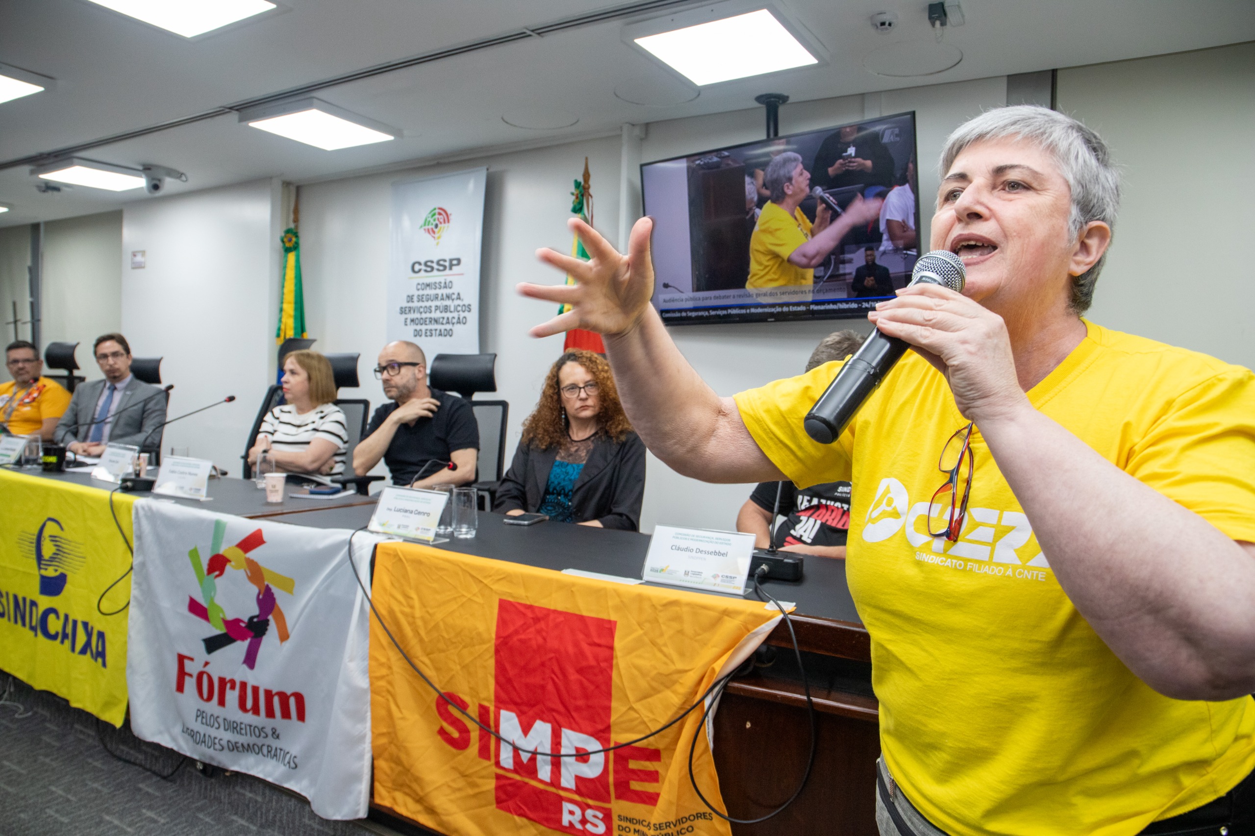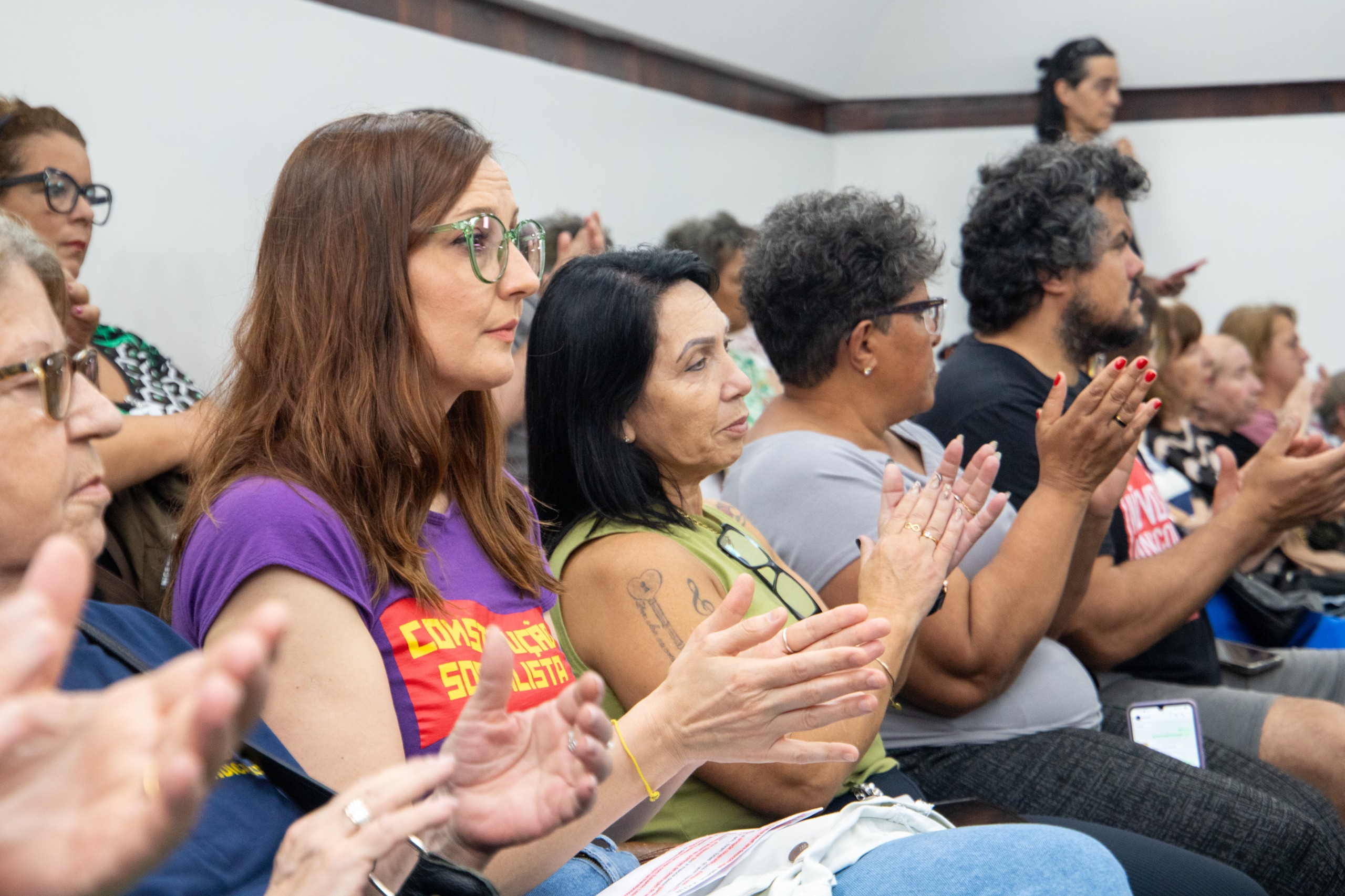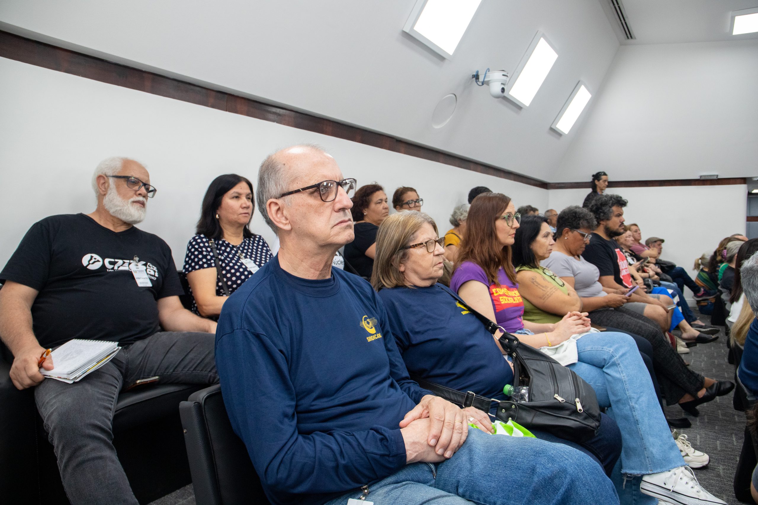 Na tarde desta sexta-feira (24), o CPERS esteve presente na Audiência Pública sobre a revisão geral dos salários no orçamento de 2026, promovida pela Comissão de Segurança, Serviços Públicos e Modernização do Estado (CSSP) da Assembleia Legislativa, presidida pelo deputado estadual Leonel Radde (PT). A atividade reuniu diversos sindicatos e organizações representantes das(os) servidoras(es) públicas(os) para debater as reivindicações e estratégias.
