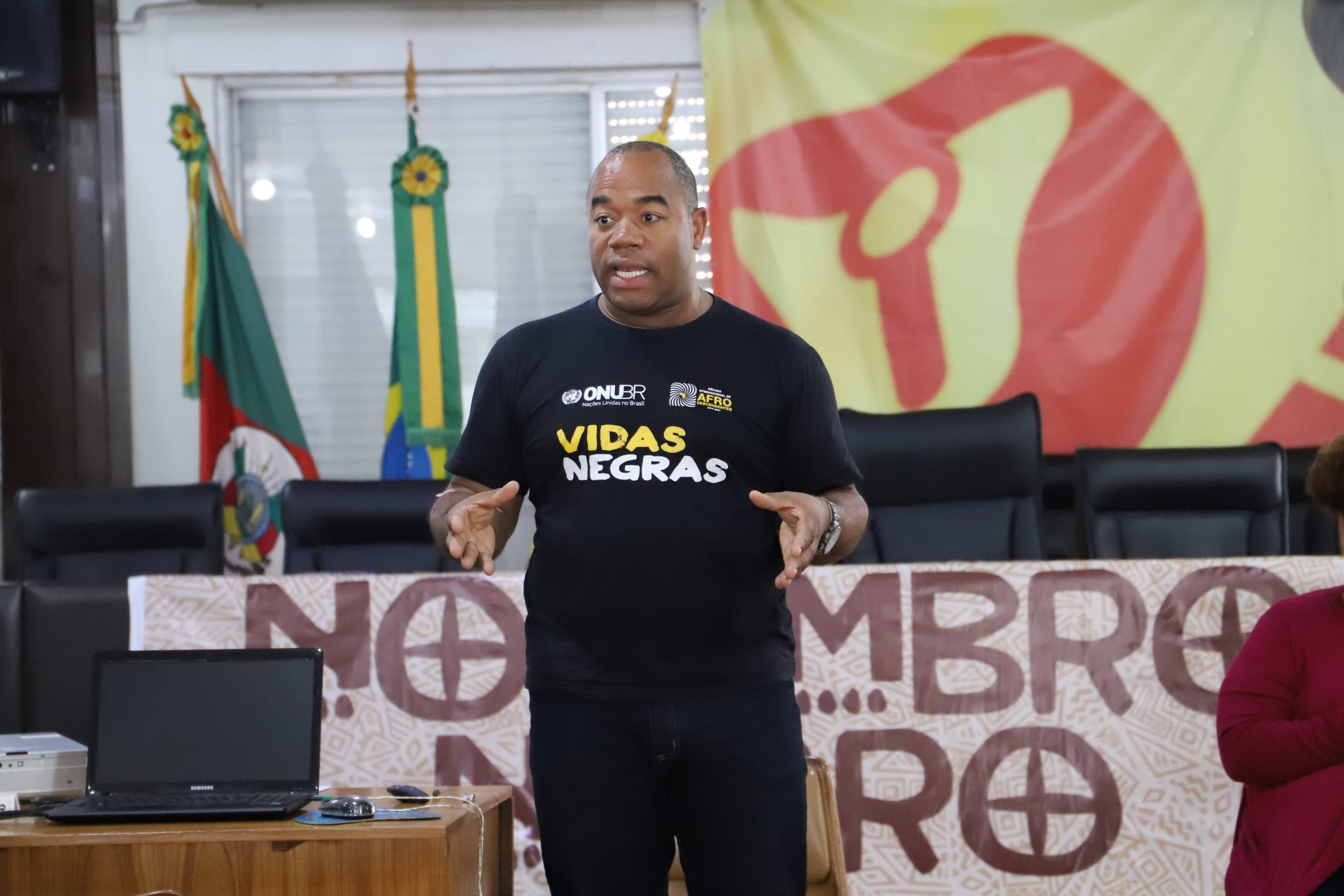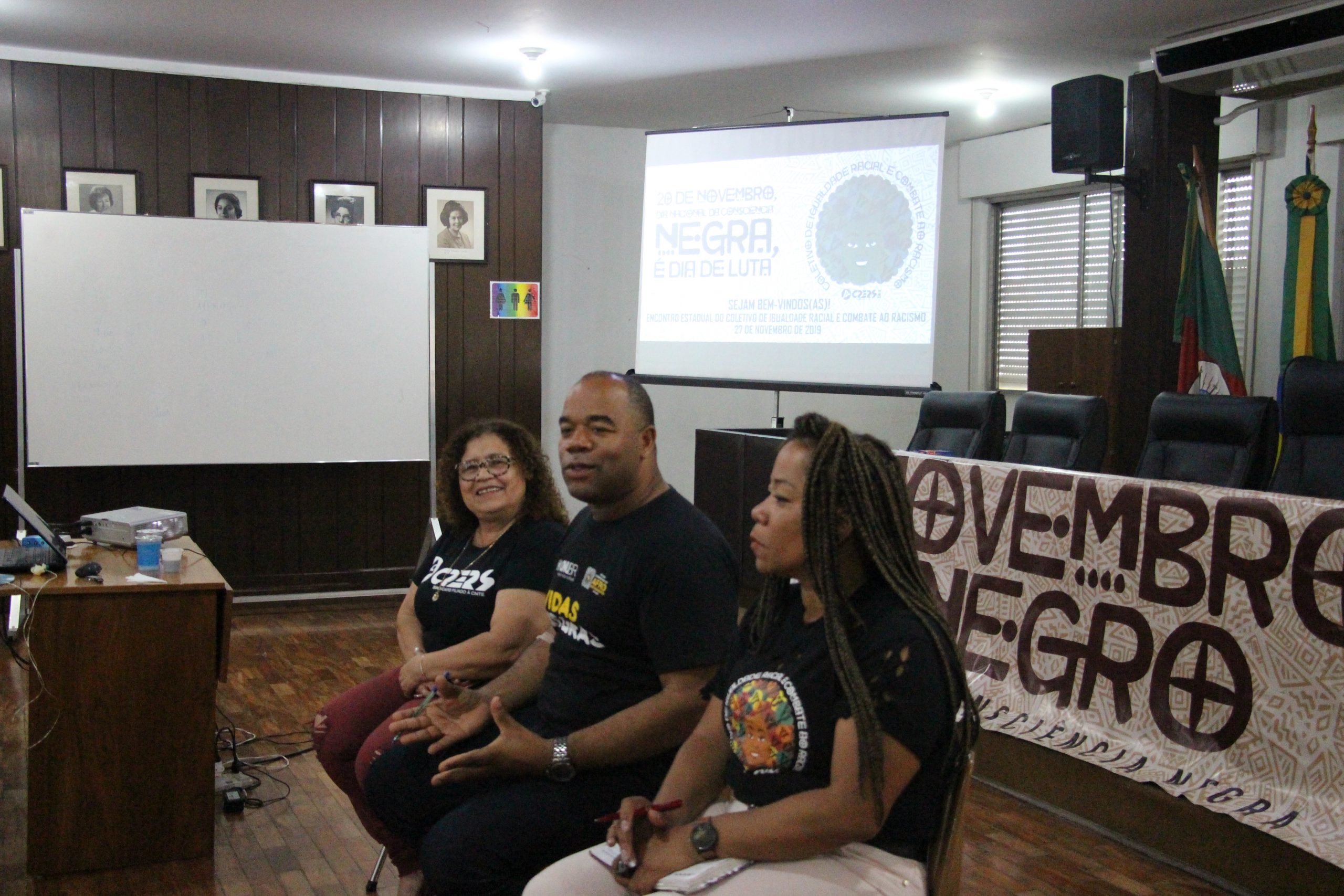 O 2º vice-presidente e coordenador do Departamento de Combate ao Racismo do CPERS, Edson Garcia, falou sobre a história de luta dos negros no país, ressaltando as grandes barreiras que ainda precisam enfrentar para combater o racismo e o preconceito sofrido diariamente. E também fez uma breve análise da conjuntura política atual no Brasil.