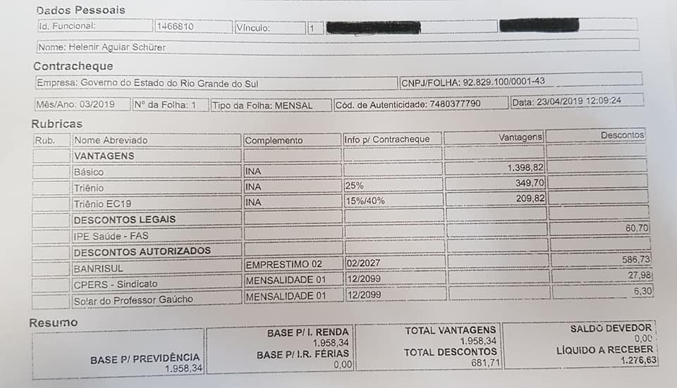 A presidente também entregou o seu contracheque, com salário líquido de R$ 1.276,63, a Eduardo Leite e questionou:”tenho 30 anos de magistério, governador. Lhe pergunto: 28,78% é muito em cima disso? Não queremos trabalhar com outra coisa. Queremos trabalhar com tranquilidade, pois amamos o que fazemos. Se fosse por dinheiro, fazer faxina seria melhor.”