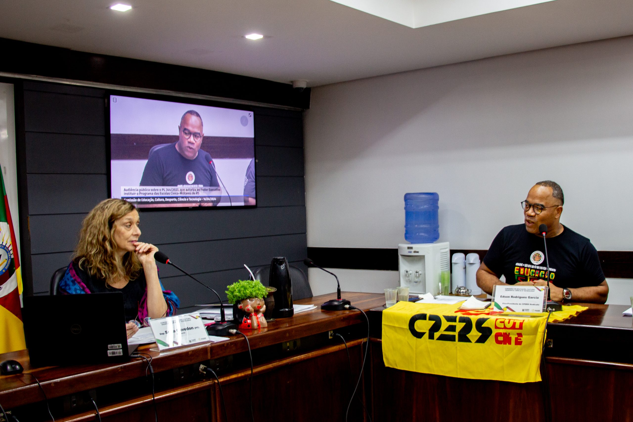 Durante a audiência, Edson criticou a falta de debate sobre o projeto das escolas cívico-militares antes da votação na ALRS. “É um desrespeito votarem em um projeto que traz consigo tanta ilegalidade. Cada parlamentar que compõe essa casa foi eleito por votos de gaúchas e gaúchos e estes merecem o devido respeito. Esperamos que os debates aconteçam anteriormente à votação de projetos e isto não aconteceu”, frisou o dirigente.