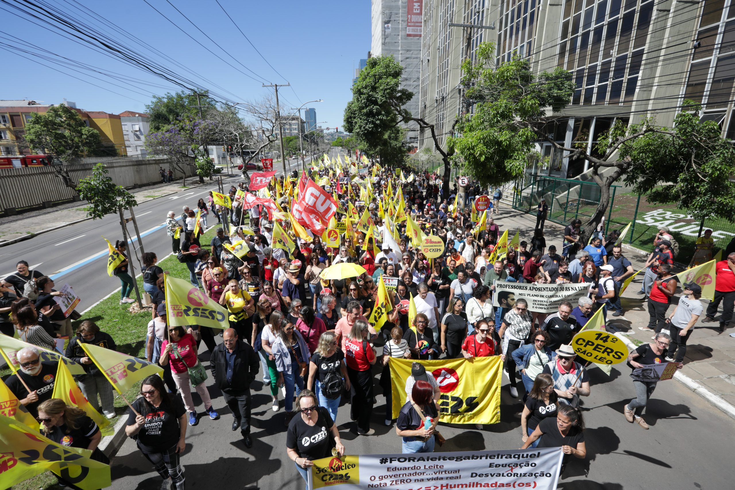 De lá, mesmo com o forte sol, a categoria saiu em uma grande caminhada até o Palácio Piratini, colorindo de amarelo as ruas do centro da capital e denunciando o descaso do governo Eduardo Leite (PSD) com a educação pública.