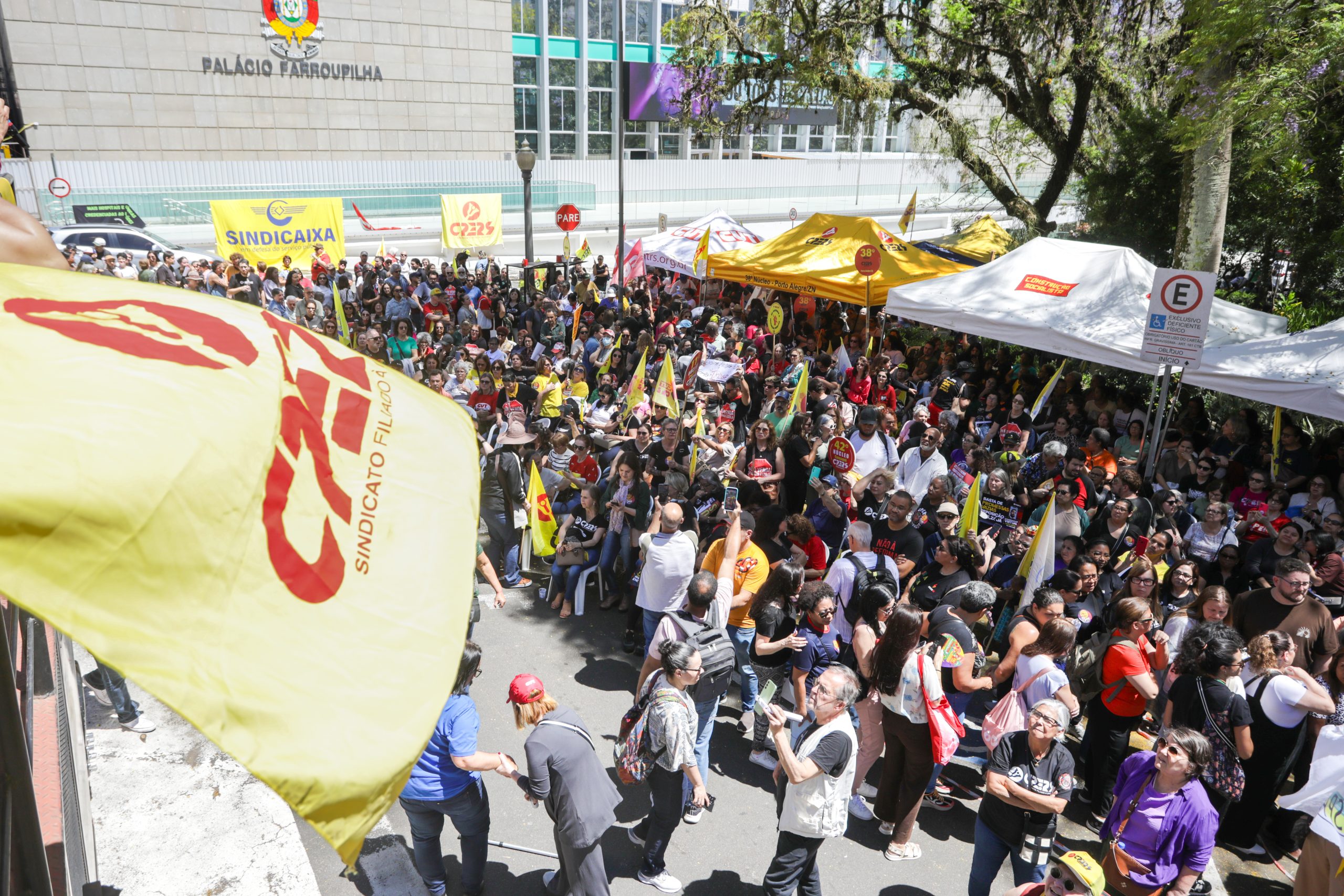 Ao chegar ao Palácio Piratini, a multidão foi recebida por parlamentares, centrais sindicais e representantes de outros sindicatos que integram a Frente dos Servidores Públicos (FSP). Juntas(os), denunciaram o desmonte do serviço público e a política de desvalorização imposta pelo governo Leite (PSD).