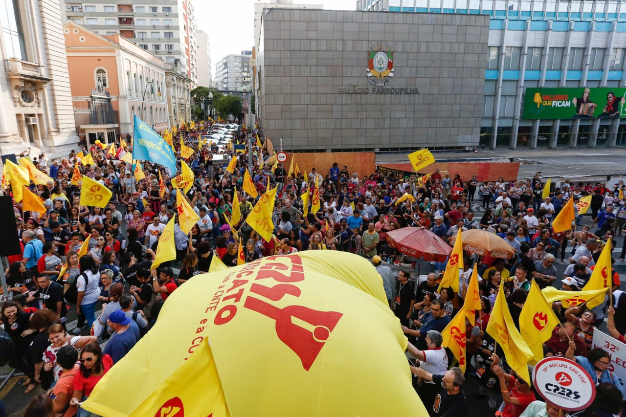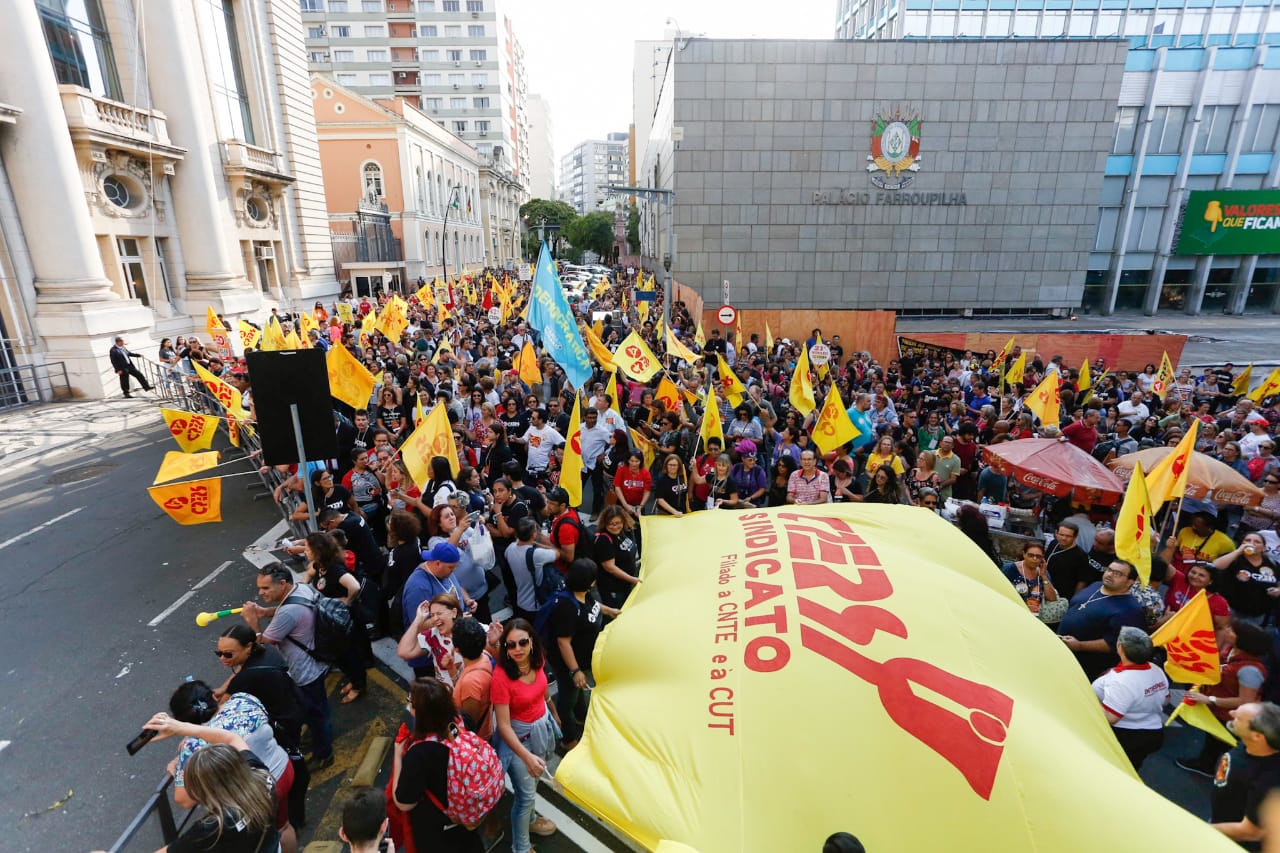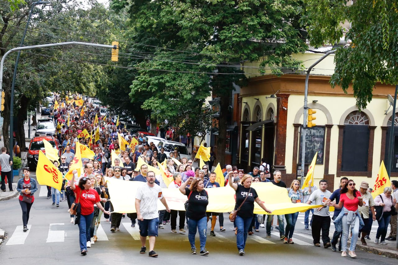 Após o término da Assembleia, os(as) educadores(as) seguiram em caminhada até o Palácio Piratini para entregar a pauta de reivindicações ao governo.