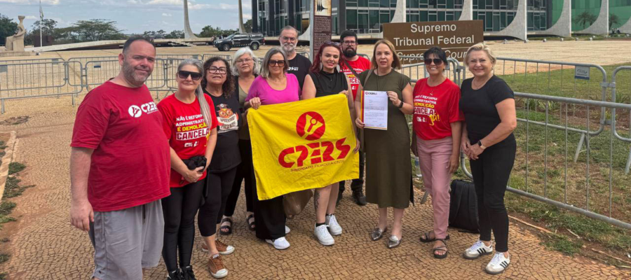 Na tarde desta quarta-feira (29), aproveitando a passagem por Brasília para participar do ato contra a Reforma Administrativa, uma delegação do CPERS esteve no Supremo Tribunal Federal (STF) para reforçar a exigência pela retomada da ADI 6254 na pauta de julgamentos.