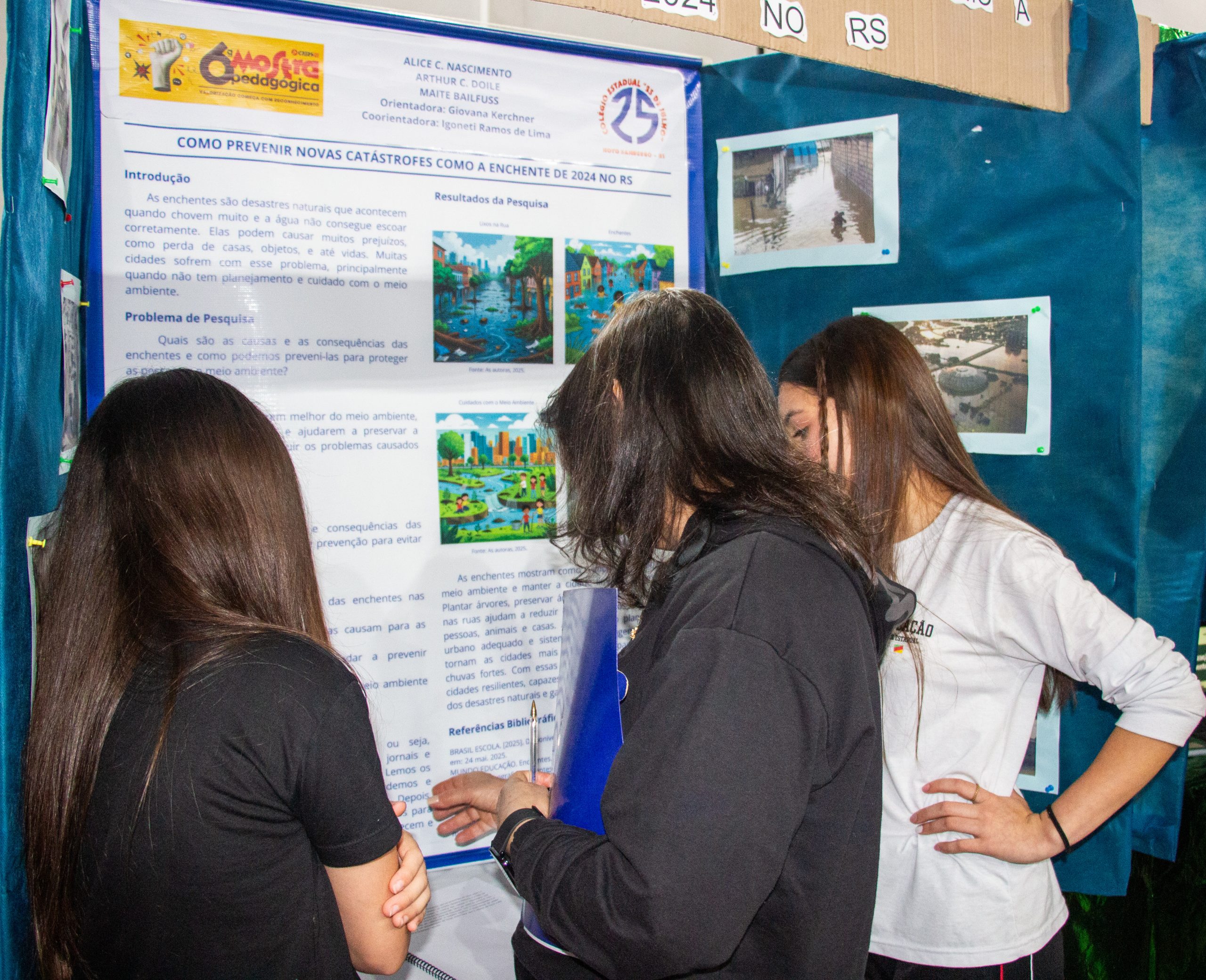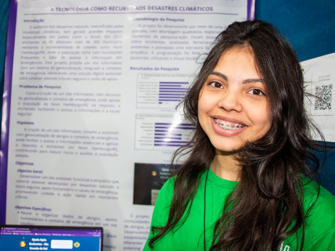 Um dos projetos apresentados, intitulado “A Tecnologia como Recurso aos Desastres Climáticos”, destacou o uso da tecnologia como ferramenta principal para auxiliar em situações climáticas emergenciais. Para isso, as(os) estudantes desenvolveram um site informativo com geolocalização de abrigos e contatos de emergência, visando facilitar o acesso rápido a informações essenciais. O projeto busca promover a importância da pesquisa científica para desenvolver soluções eficazes, que possam ser aplicadas na prática, contribuindo para a segurança das comunidades e a preservação do meio ambiente.