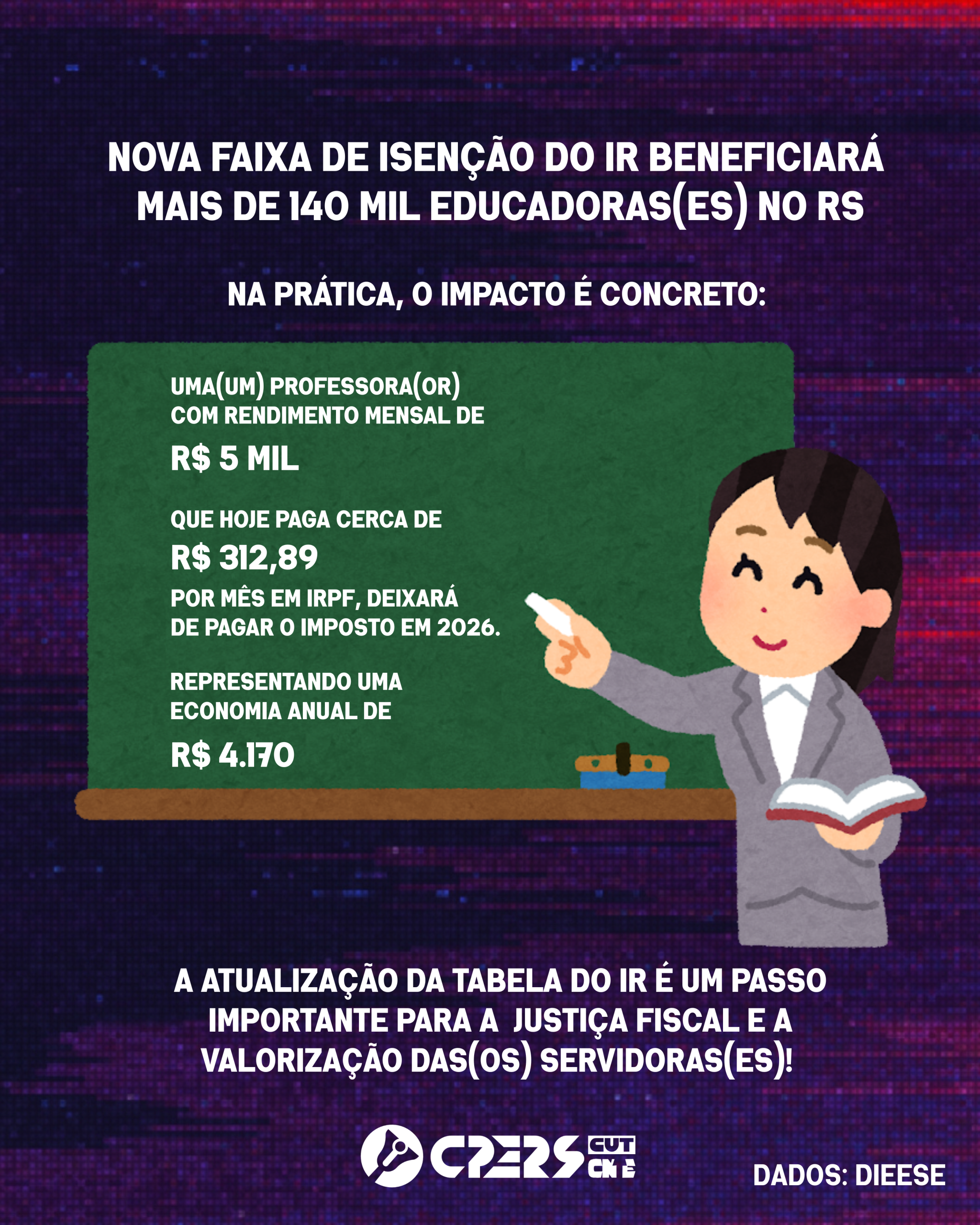 De acordo com o Departamento Intersindical de Estatística e Estudos Socioeconômicos (DIEESE), a ampliação da faixa de isenção do IR poderá beneficiar mais de 140 mil servidoras(es) da educação gaúcha, o que representa 88,2% das(os) profissionais da Secretaria da Educação (SEDUC). Em todo o país, mais de 20 milhões de trabalhadoras(es) serão contemplados com a nova faixa de isenção.