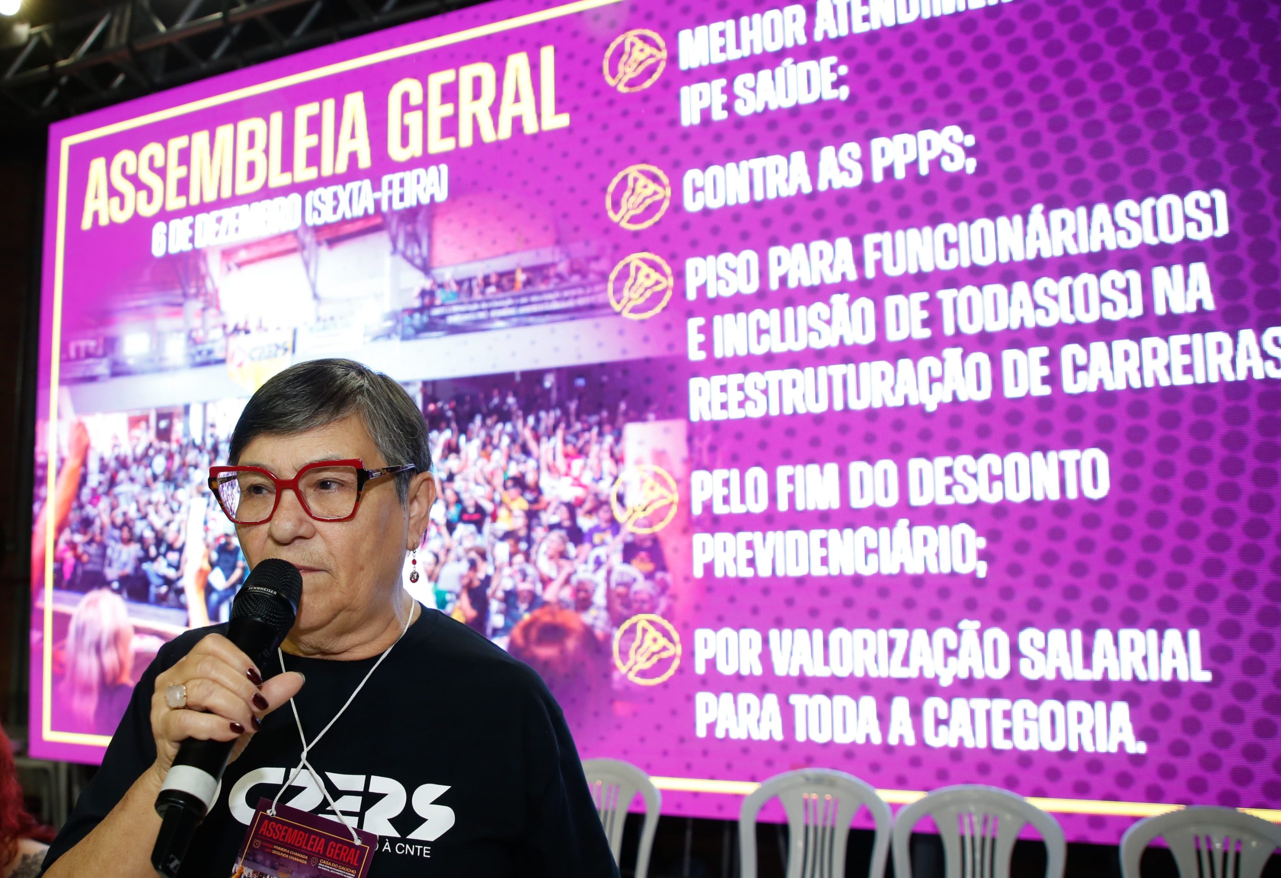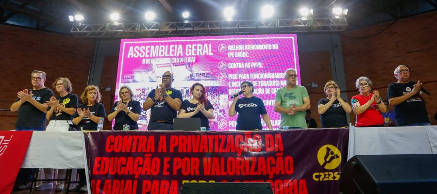 Já no período da tarde, as(os) educadoras(es) participaram da última Assembleia Geral de Mobilização do ano, na Casa do Gaúcho. O encontro foi marcado pela discussão de pautas prioritárias, entre elas a melhoria no atendimento do IPE Saúde, a luta contra as parcerias público-privadas na educação, a aplicação do Piso Nacional para funcionárias e funcionários de escola, e a valorização salarial para toda a categoria.