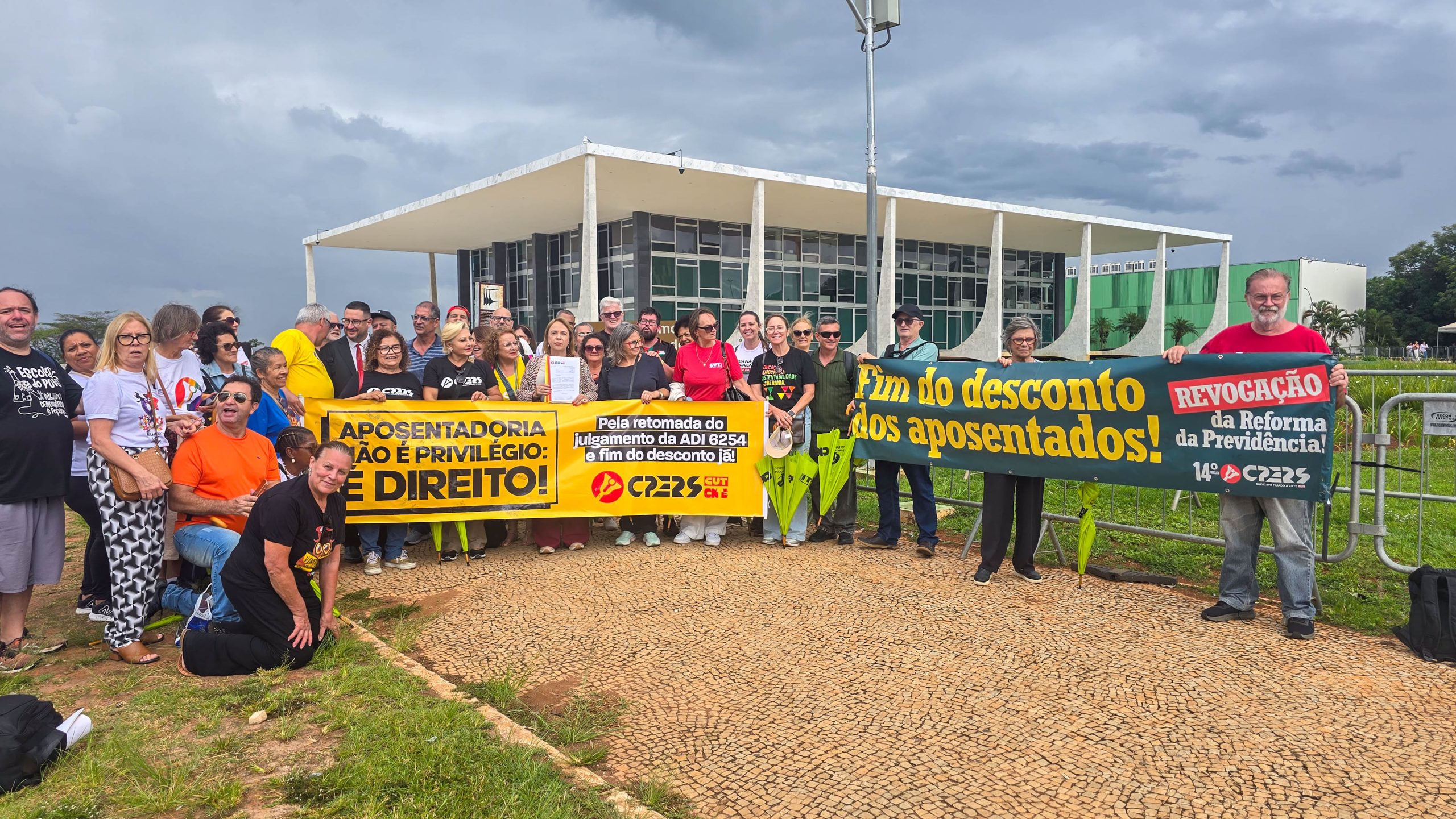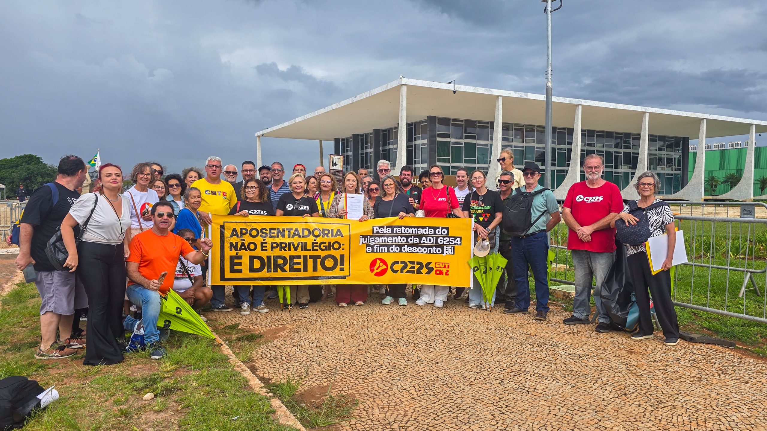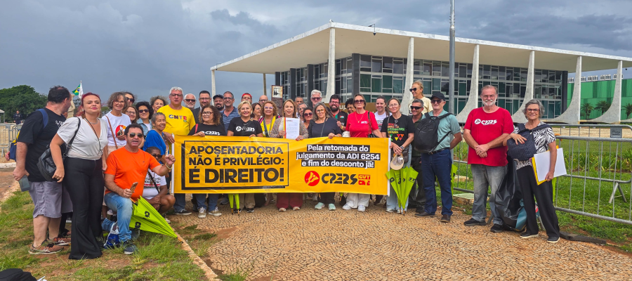 Na tarde desta quarta-feira (15), uma delegação do CPERS esteve no Supremo Tribunal Federal (STF), em Brasília, para exigir a retomada da ADI 6254 na pauta de julgamentos. A ação trata da cobrança de contribuição previdenciária de servidoras(es) aposentadas(os) do Rio Grande do Sul e segue pendente de análise.