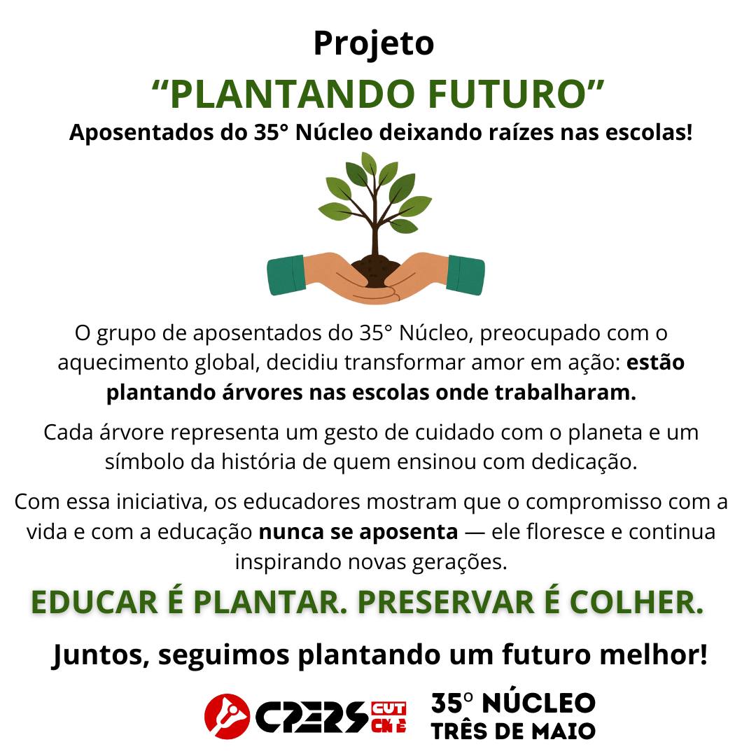 O grupo de aposentadas(os) do 35º Núcleo do CPERS (Três de Maio), preocupado com os impactos do aquecimento global, decidiu transformar o amor pela educação e pela natureza em ação concreta. O projeto, intitulado “Plantando o Futuro”, tem como objetivo envolver todas(os) as(os) trabalhadoras(es) da educação aposentadas(os) em atividades de plantio de árvores nas instituições em que atuaram, promovendo o bem comum, a transformação e a consciência ambiental entre as novas gerações.