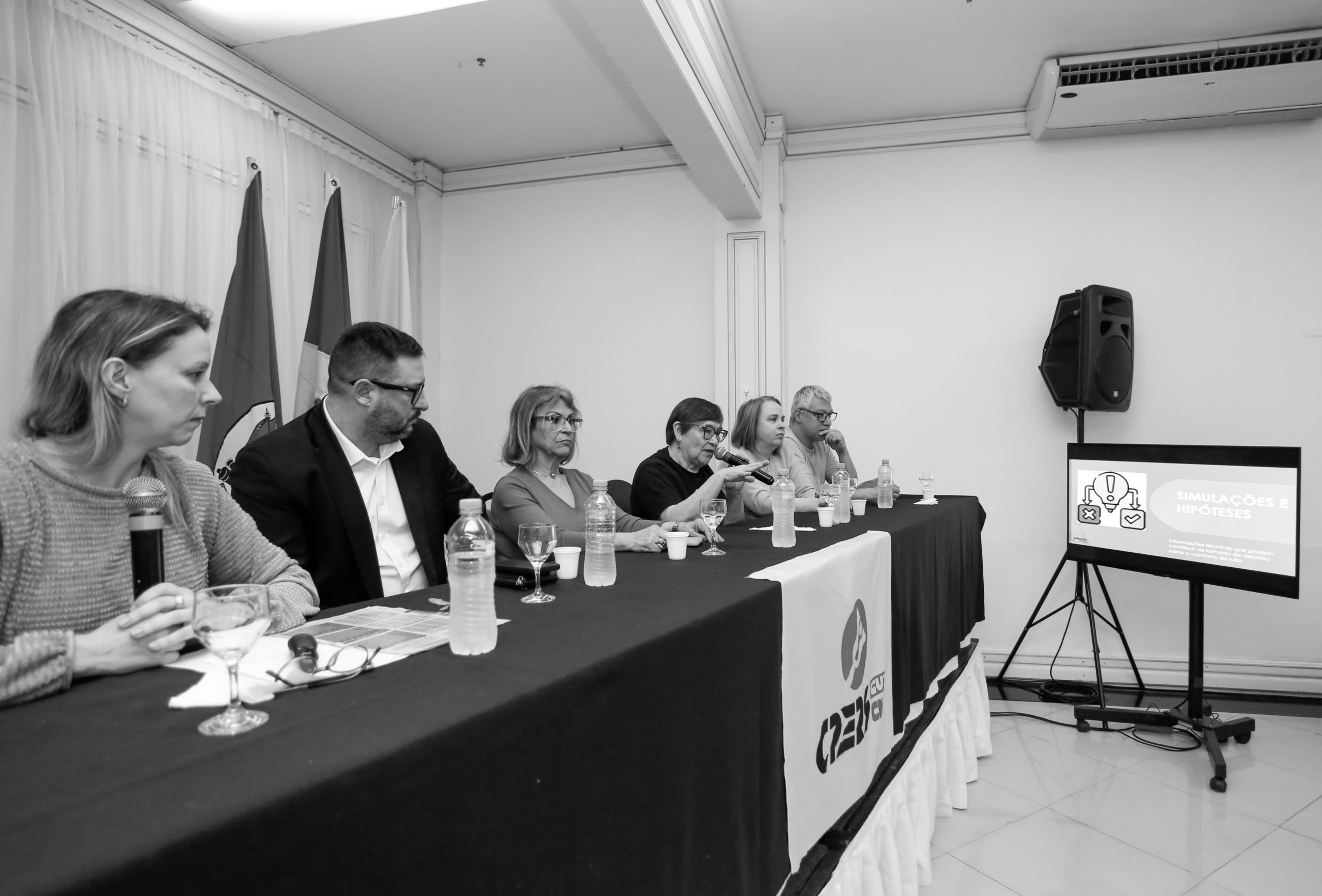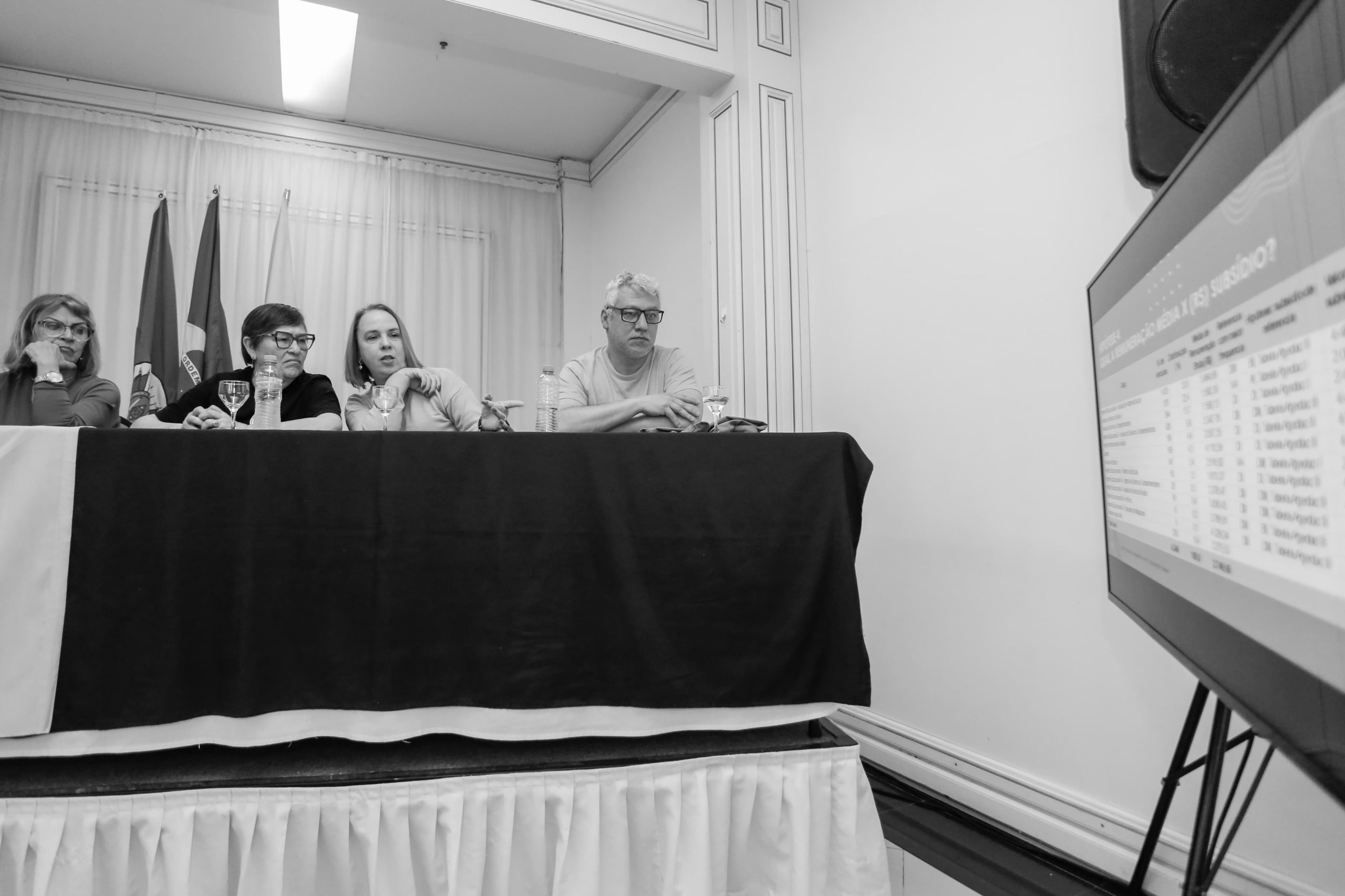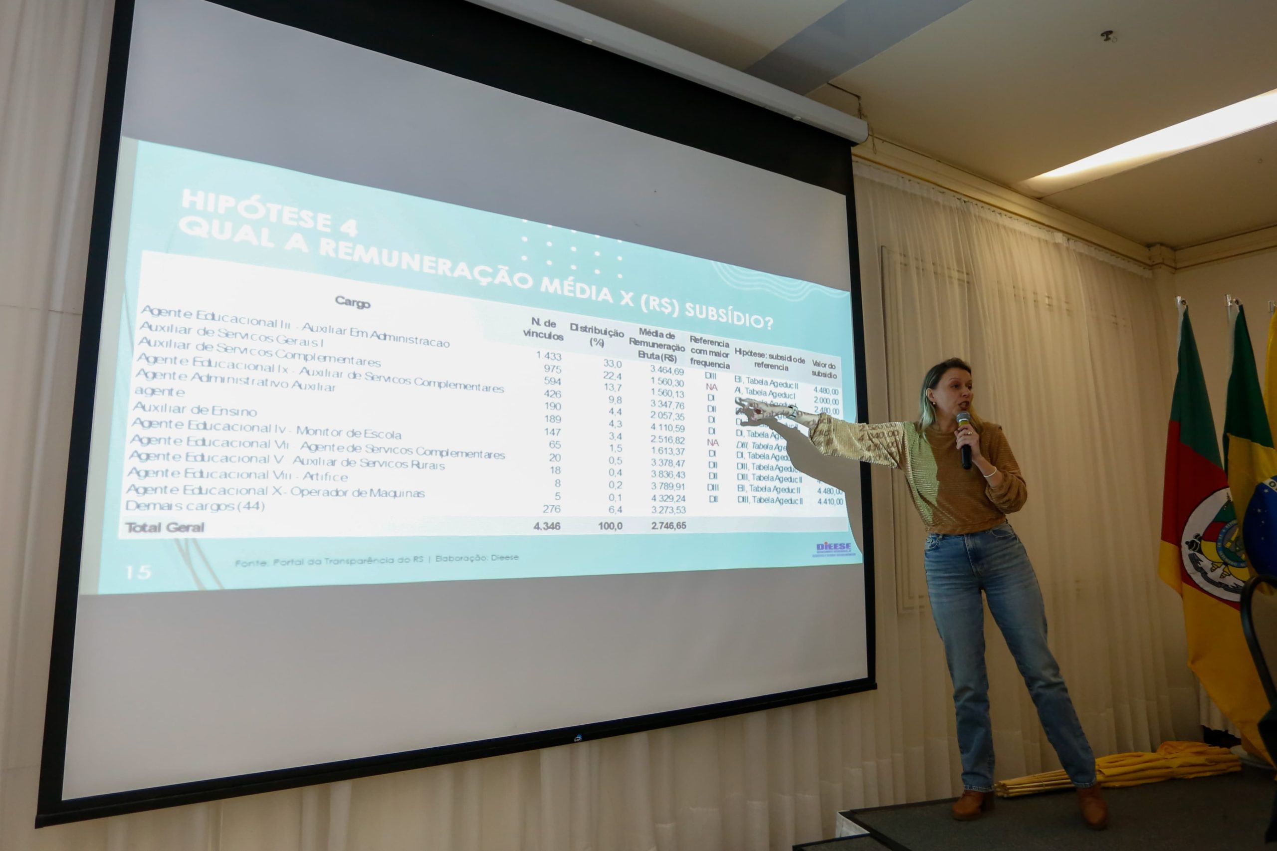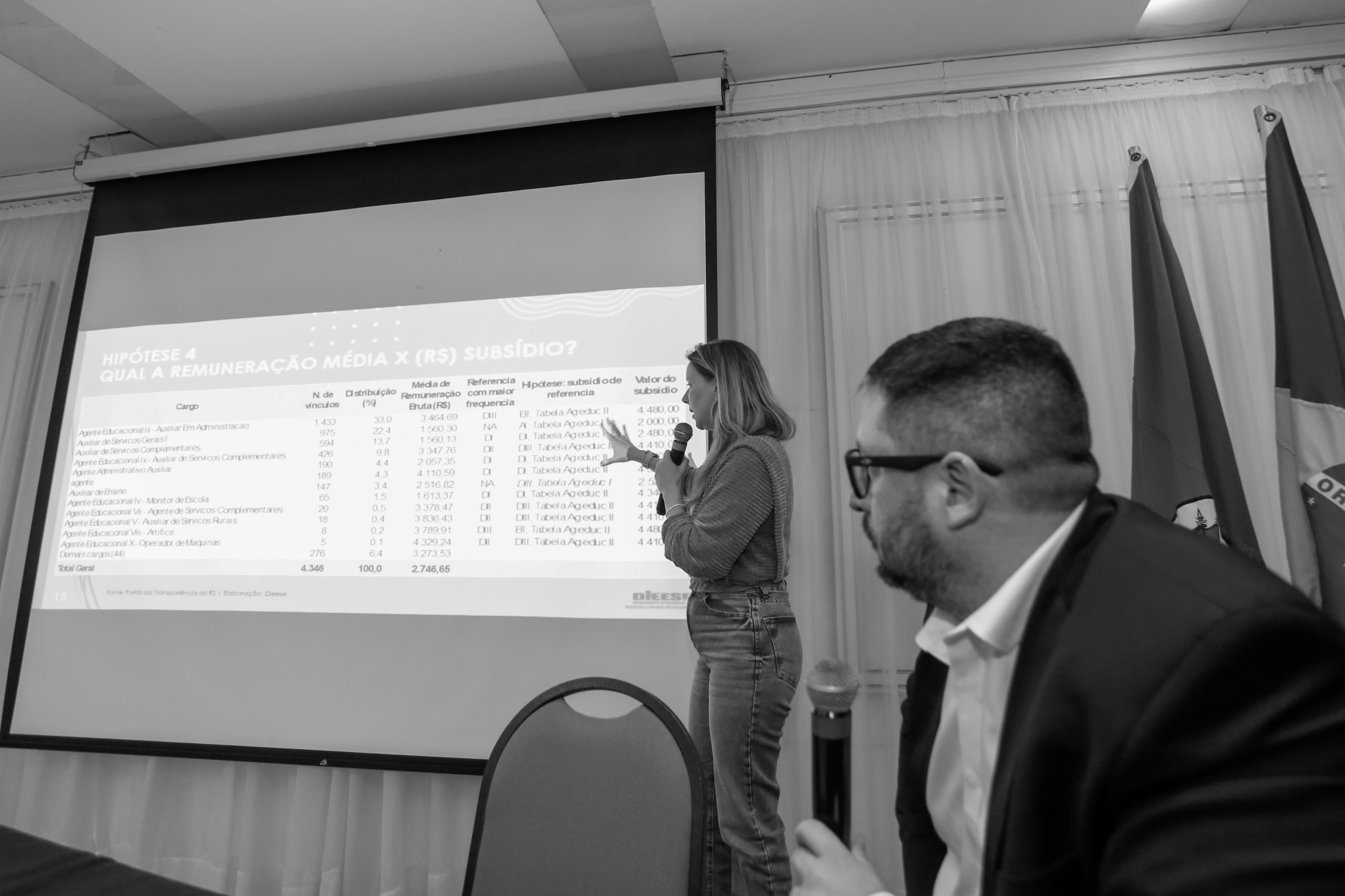 Na sequência, Anelise Manganelli, economista do Dieese, apresentou uma série de simulações com as possíveis repercussões salariais para os cargos excluídos e quais os possíveis cenários para estas(es) servidoras(es).