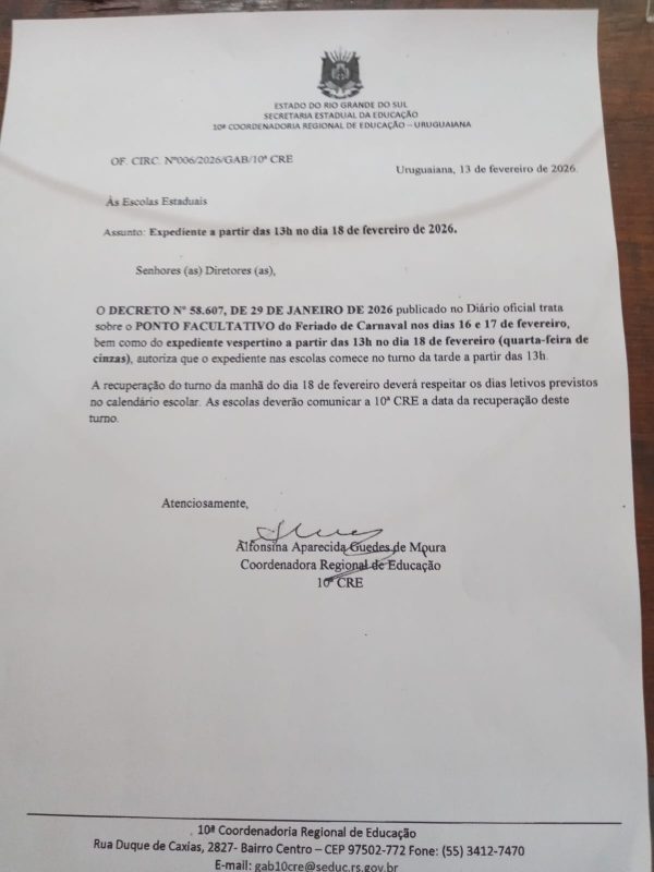 A incoerência torna-se ainda mais grave quando, nesta sexta-feira (13), a 10ª Coordenadoria Regional de Educação (CRE) – Uruguaiana encaminhou ofício às escolas de sua região informando que, em razão do mesmo decreto estadual, as aulas retornarão somente no turno da tarde.