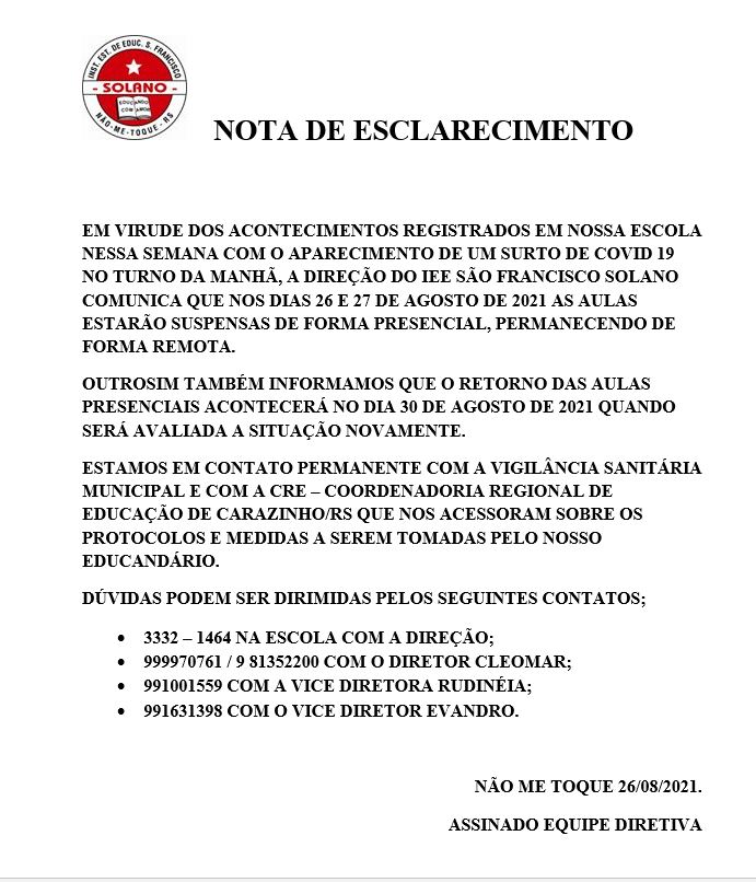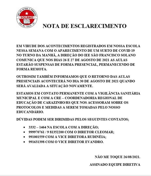 Um surto de Covid-19, que até o momento atingiu 15 alunos, entre 15 e 17 anos, e uma professora, fez com que o Instituto Estadual de Educação São Francisco Solano, em Não-Me-Toque, comunicasse, nesta quinta-feira (26), a suspensão das aulas presenciais.